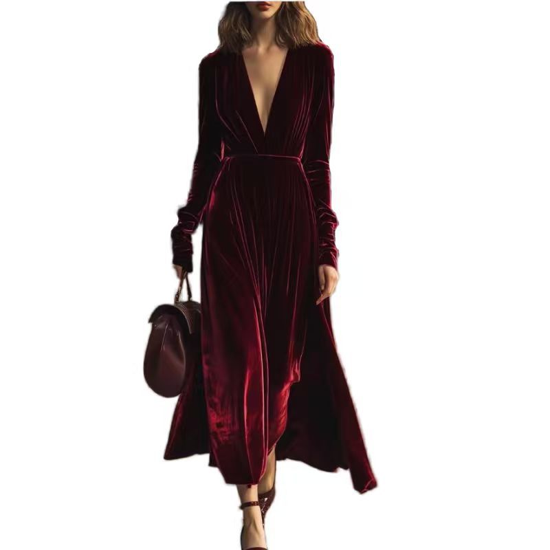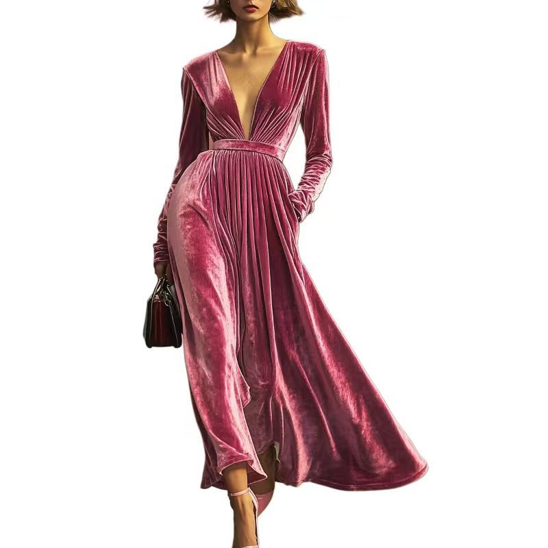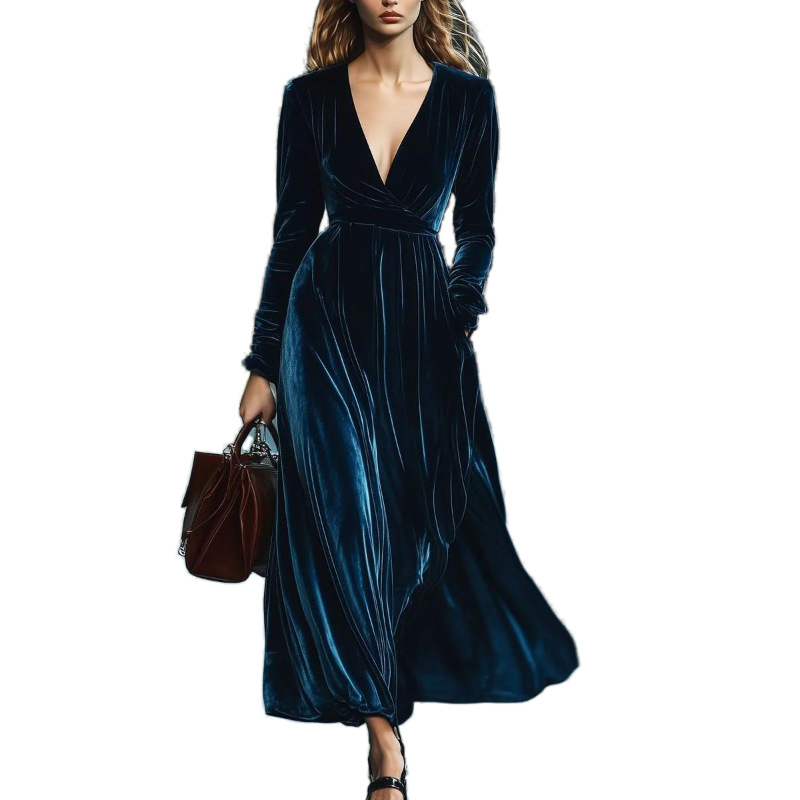 Cropped-waist Deep-V-neck Long Dress With Ruched Detailing