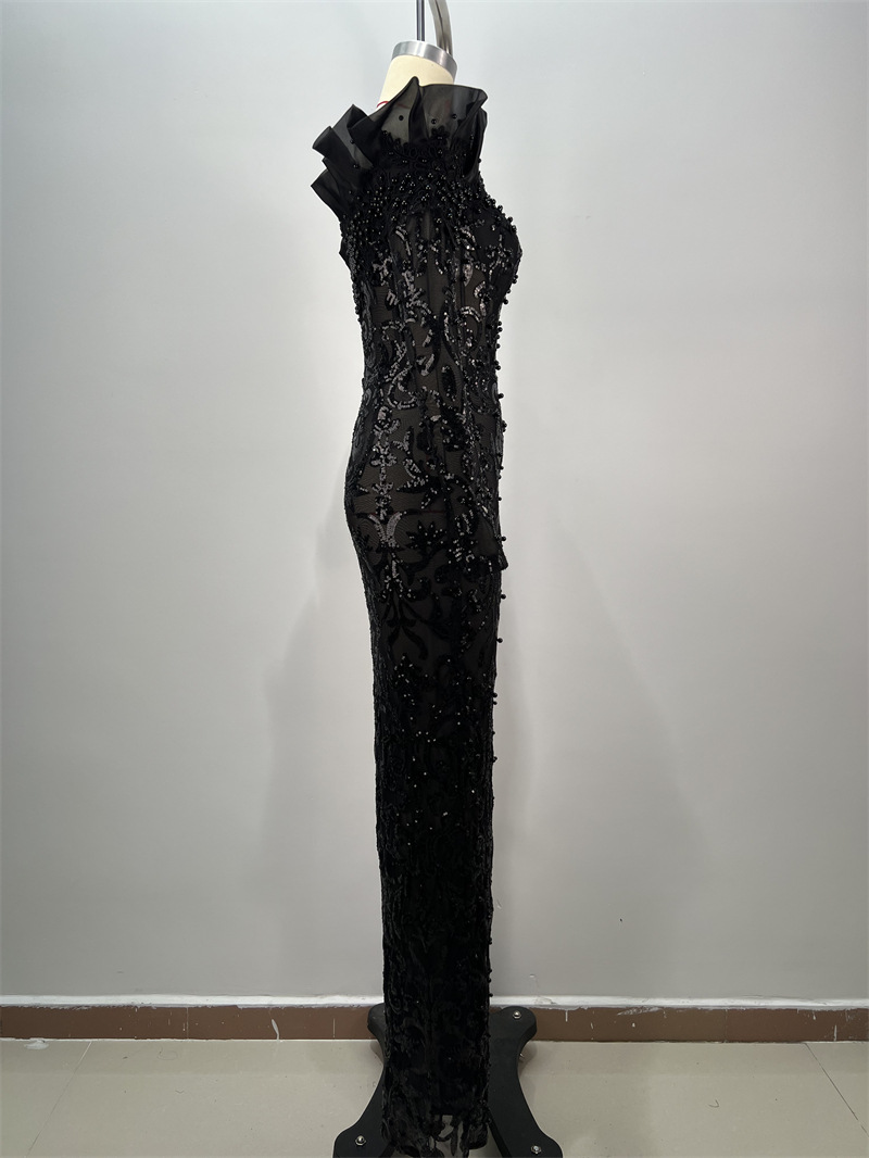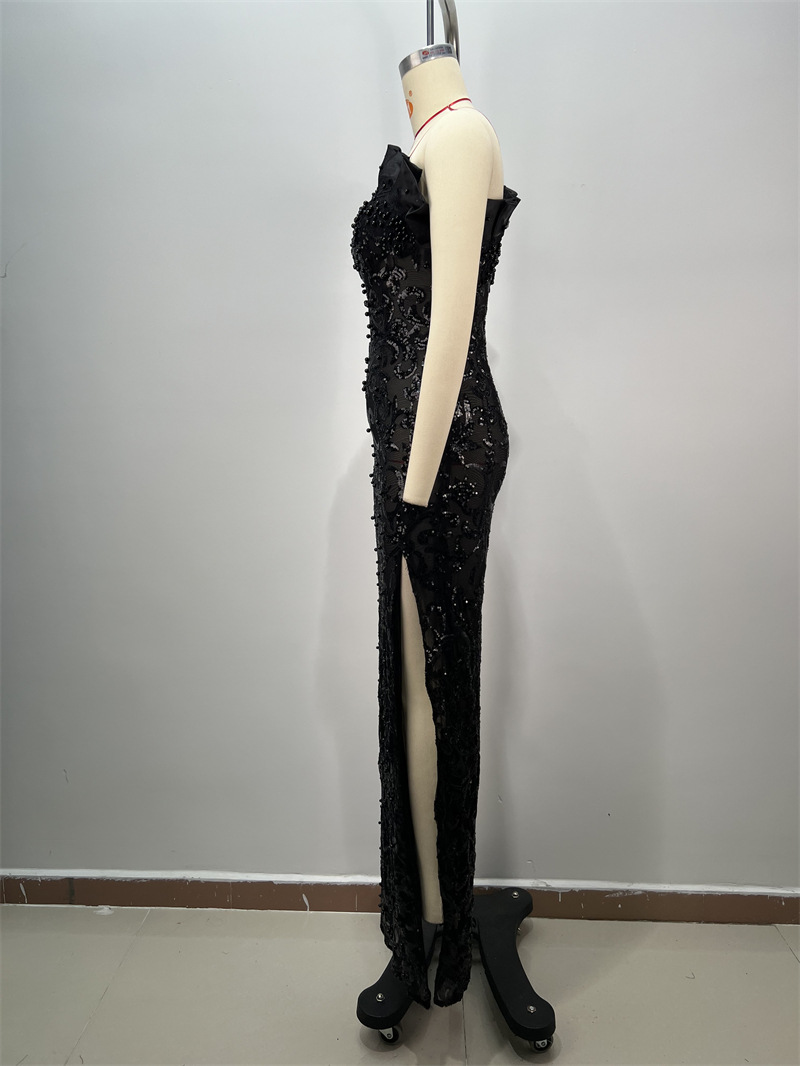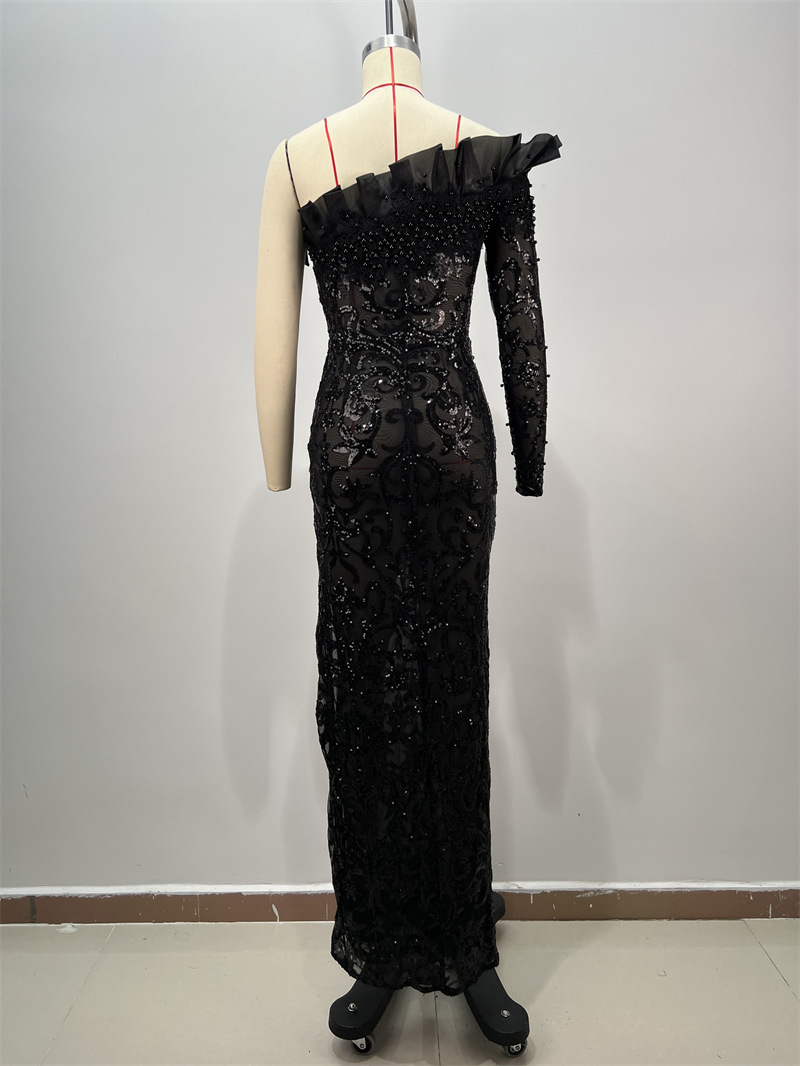 Sexy Sequins Embroidery One Shoulder High Slit Black Dress
