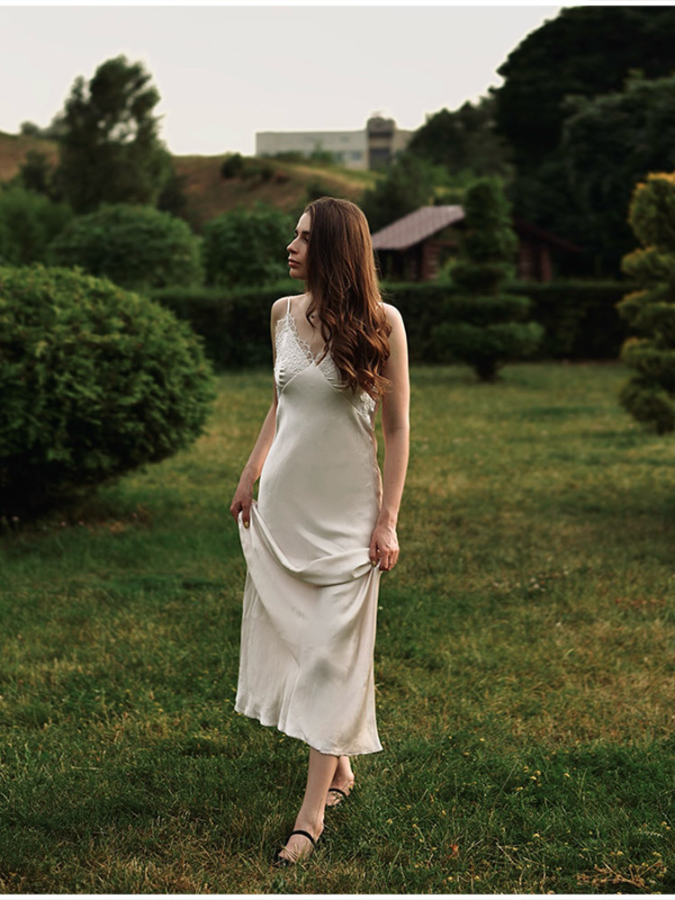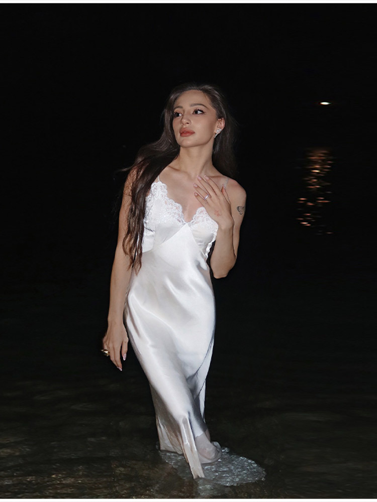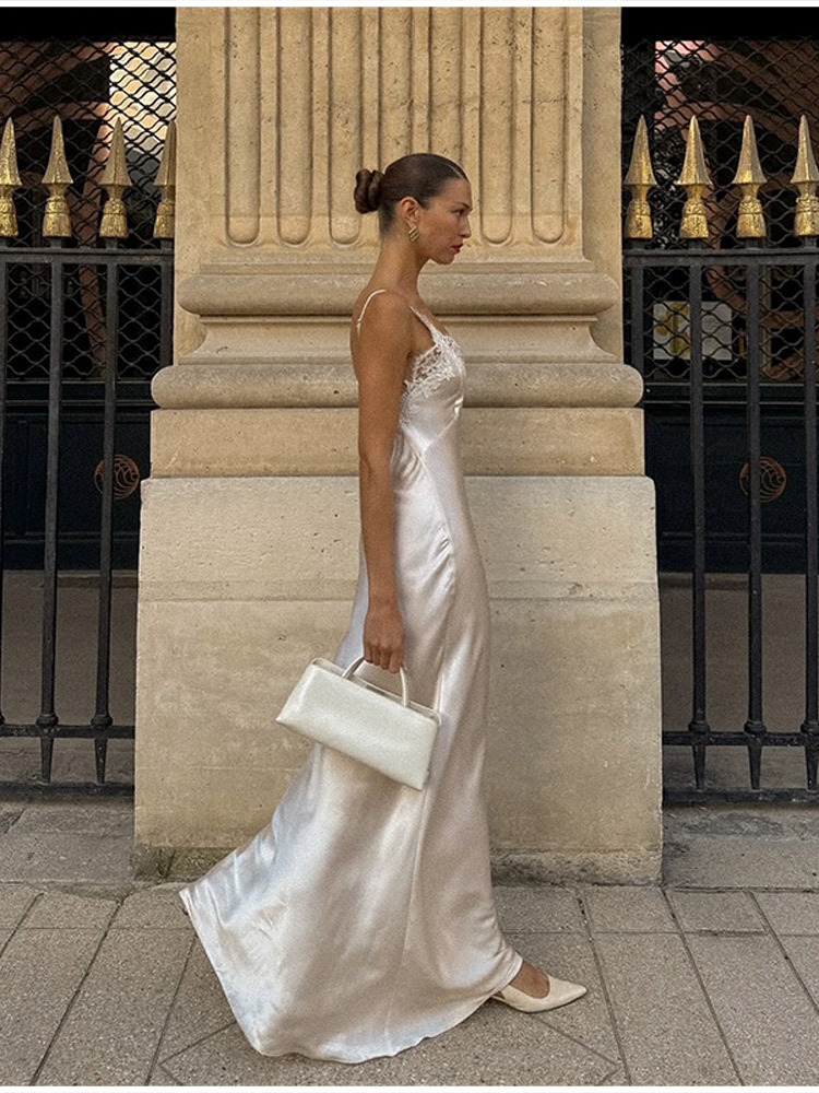 V-neck Lace-panel Long Satin Slip Dress