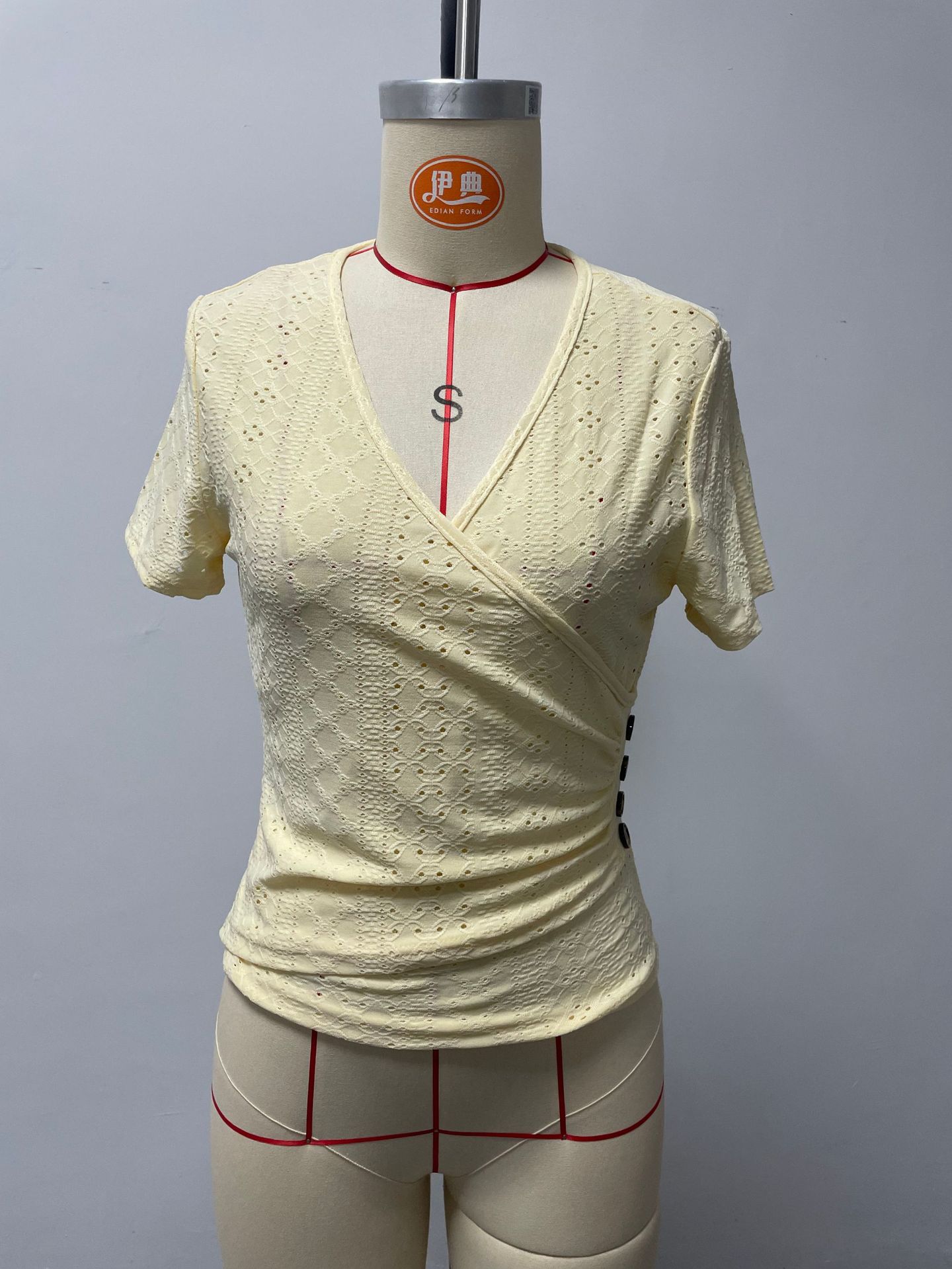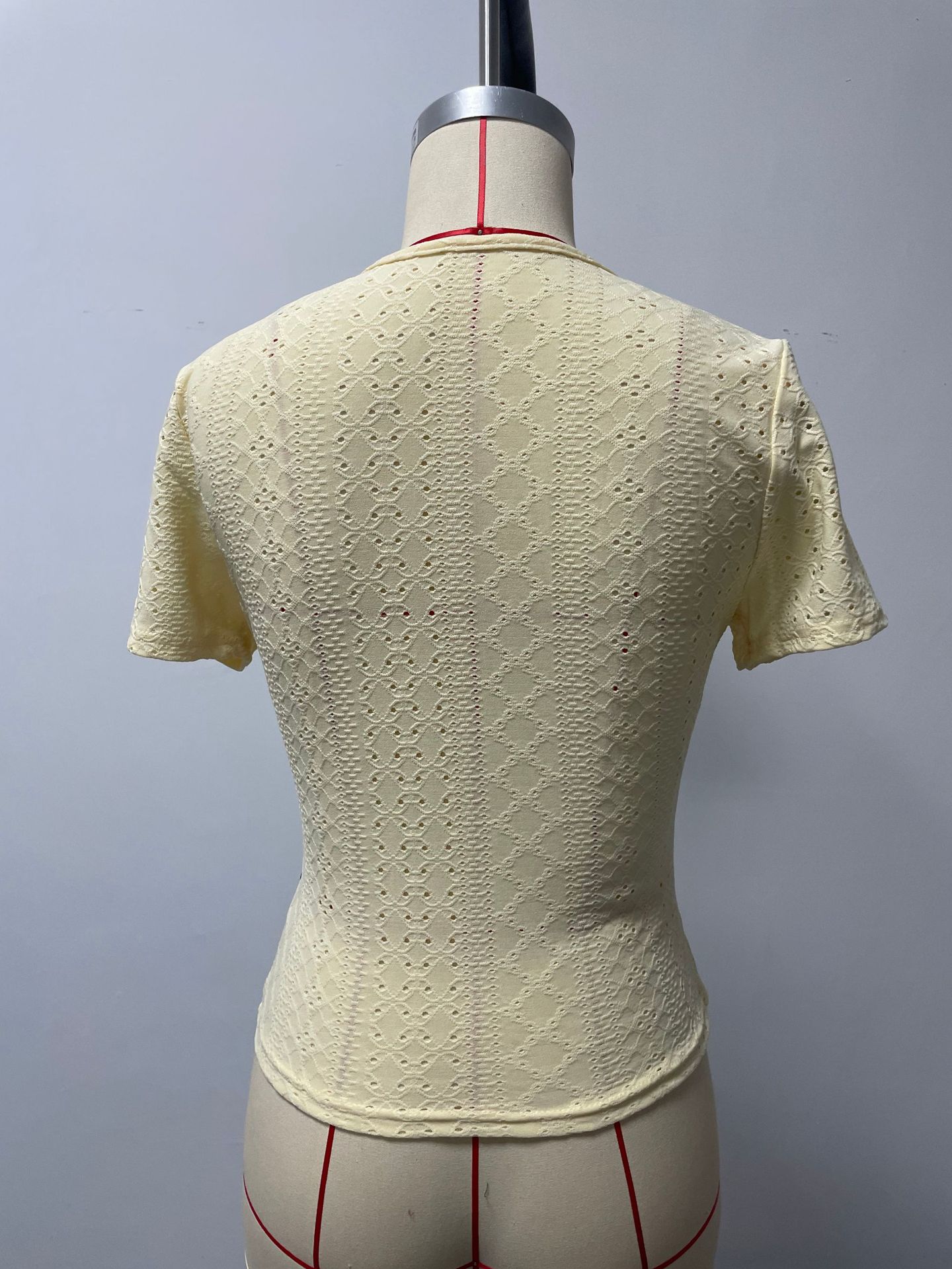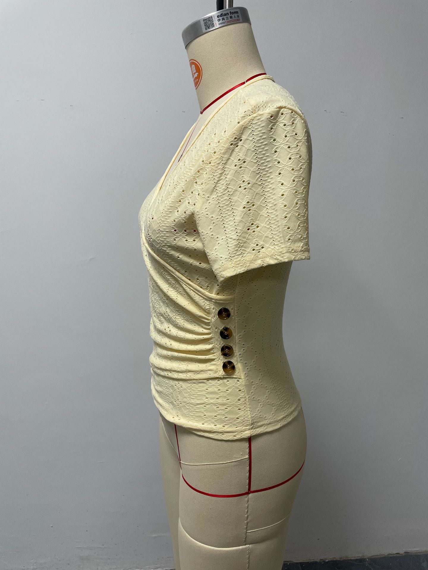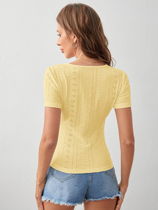 Fashionable Knitted Hollow Button Deep V-neck Waist-controlled Slimming T-shirt