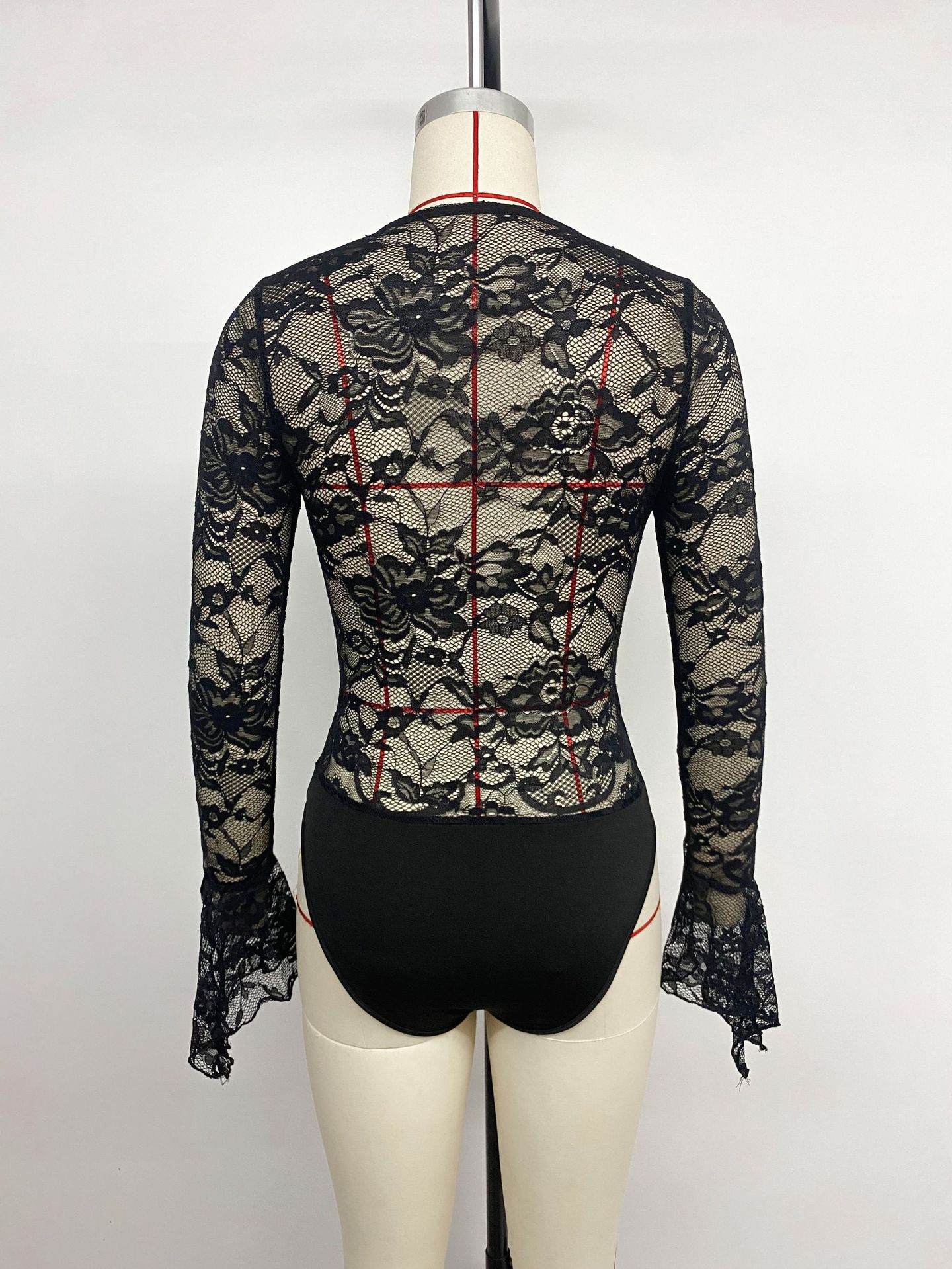 Lace-trimmed V-neck Bodycon Black Jumpsuit