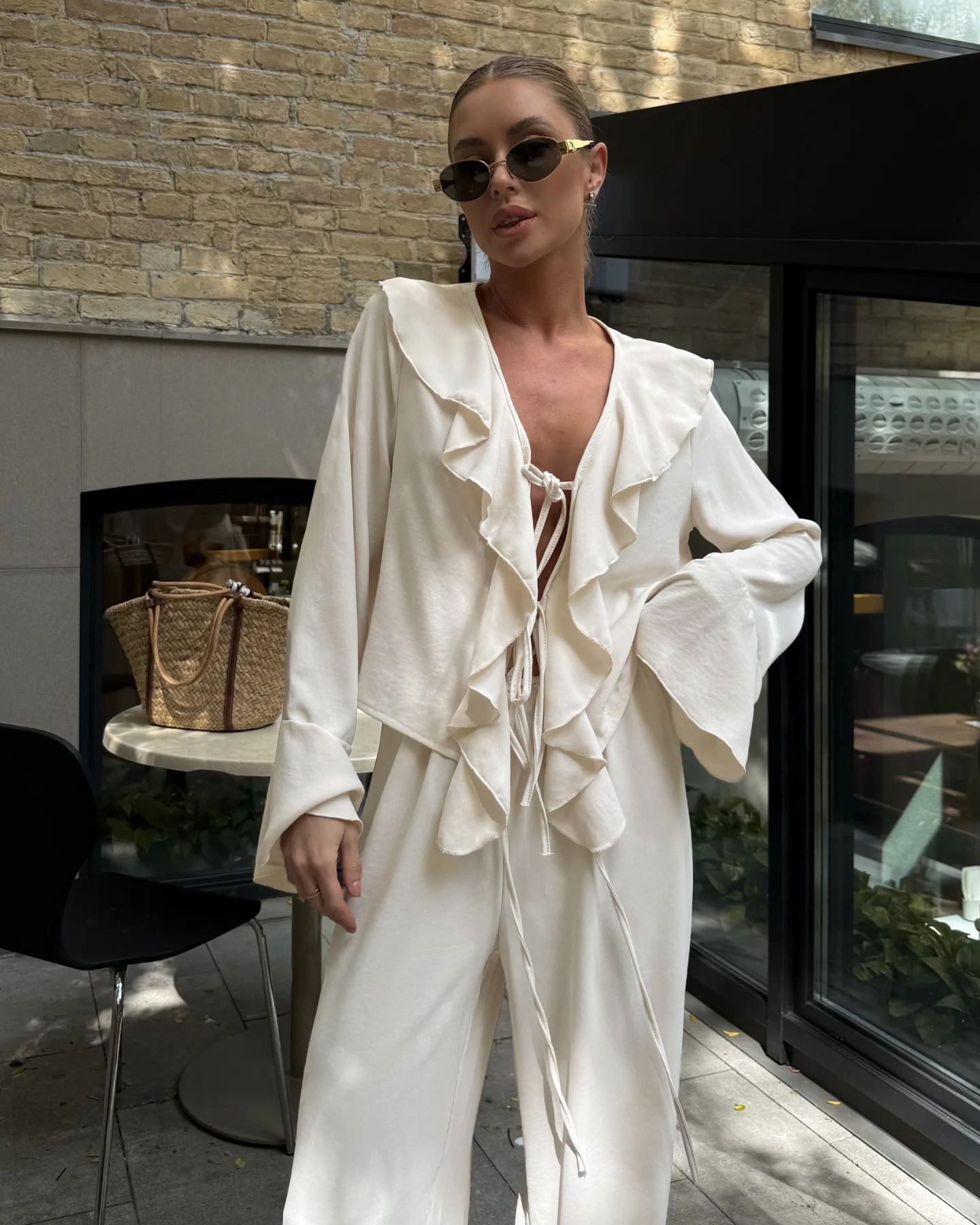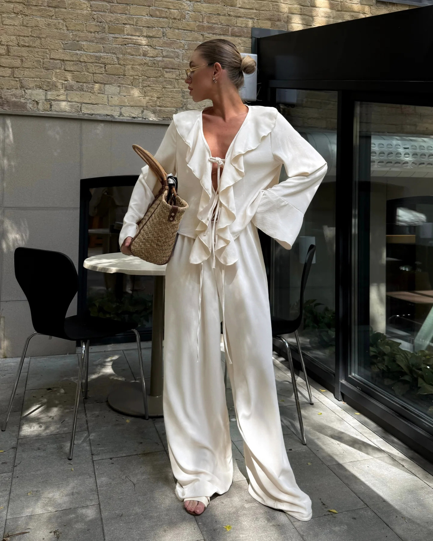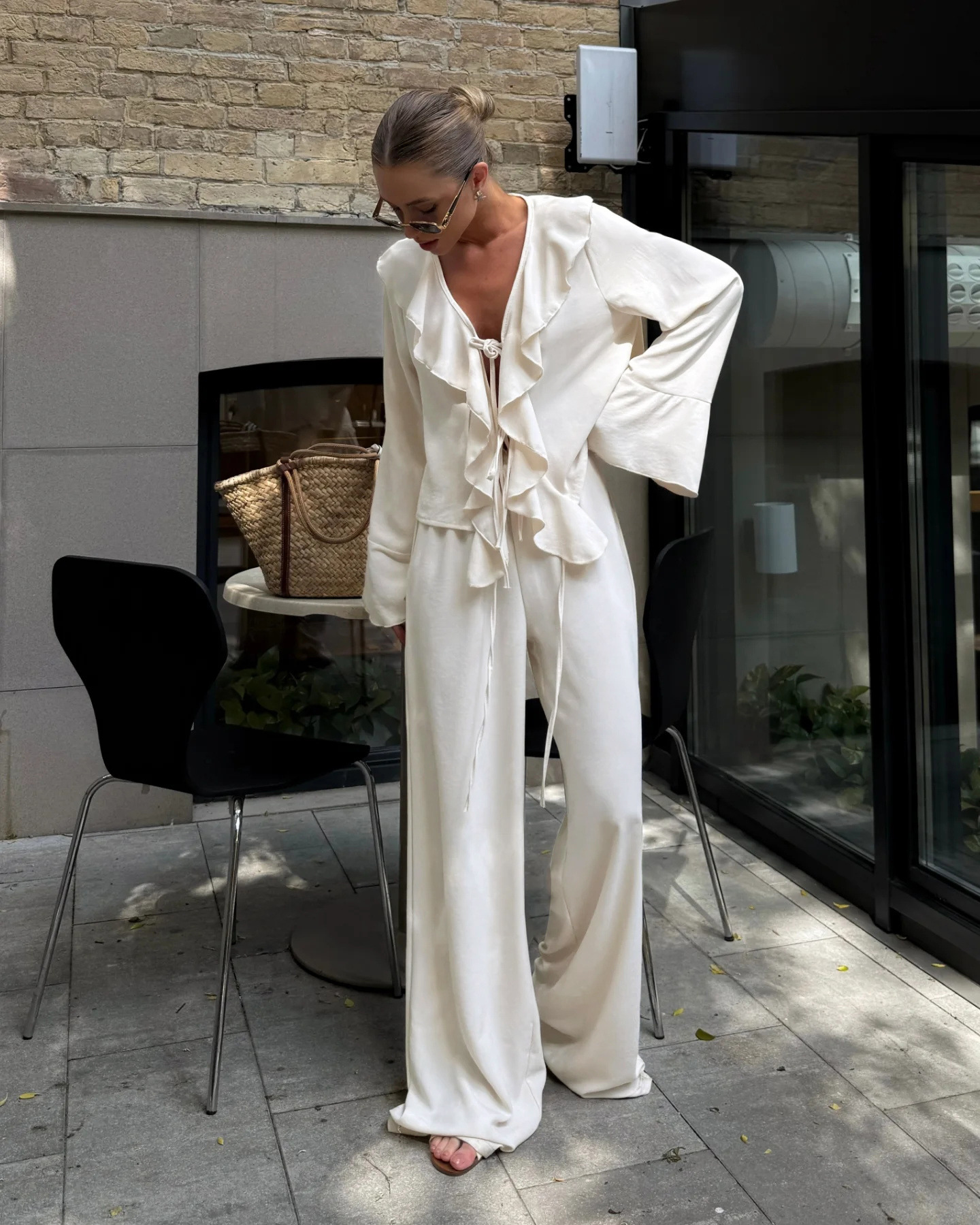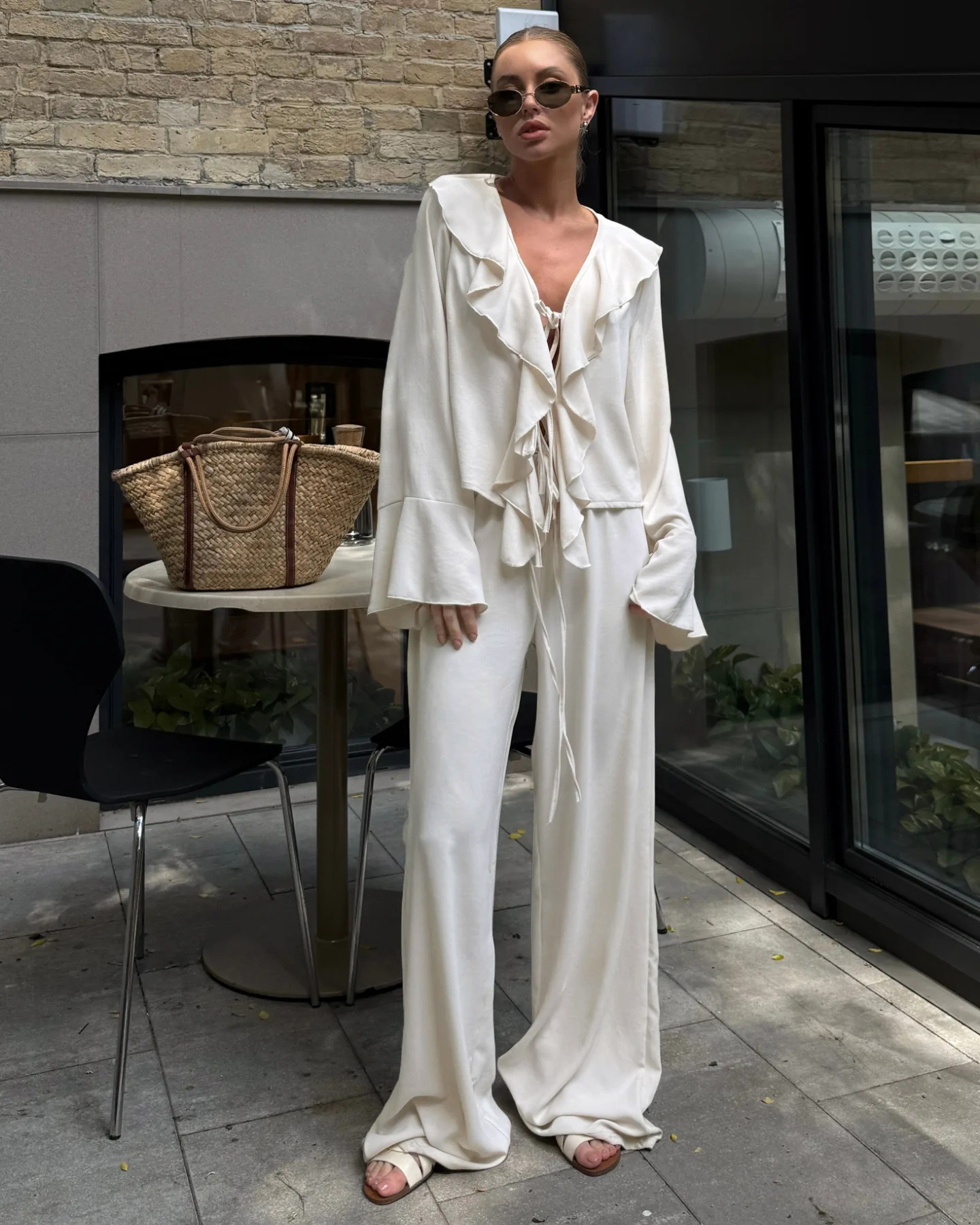V-neck Ruffled Long-sleeve Shirt And High-waist Wide-leg Pants Two-piece Set Τιμή πώλησης€54,76