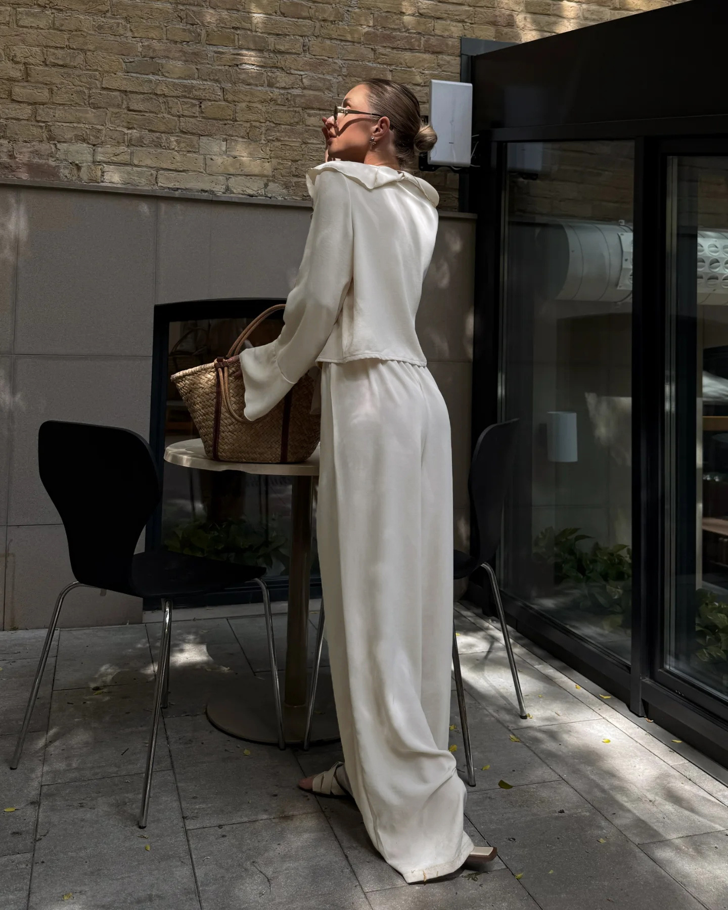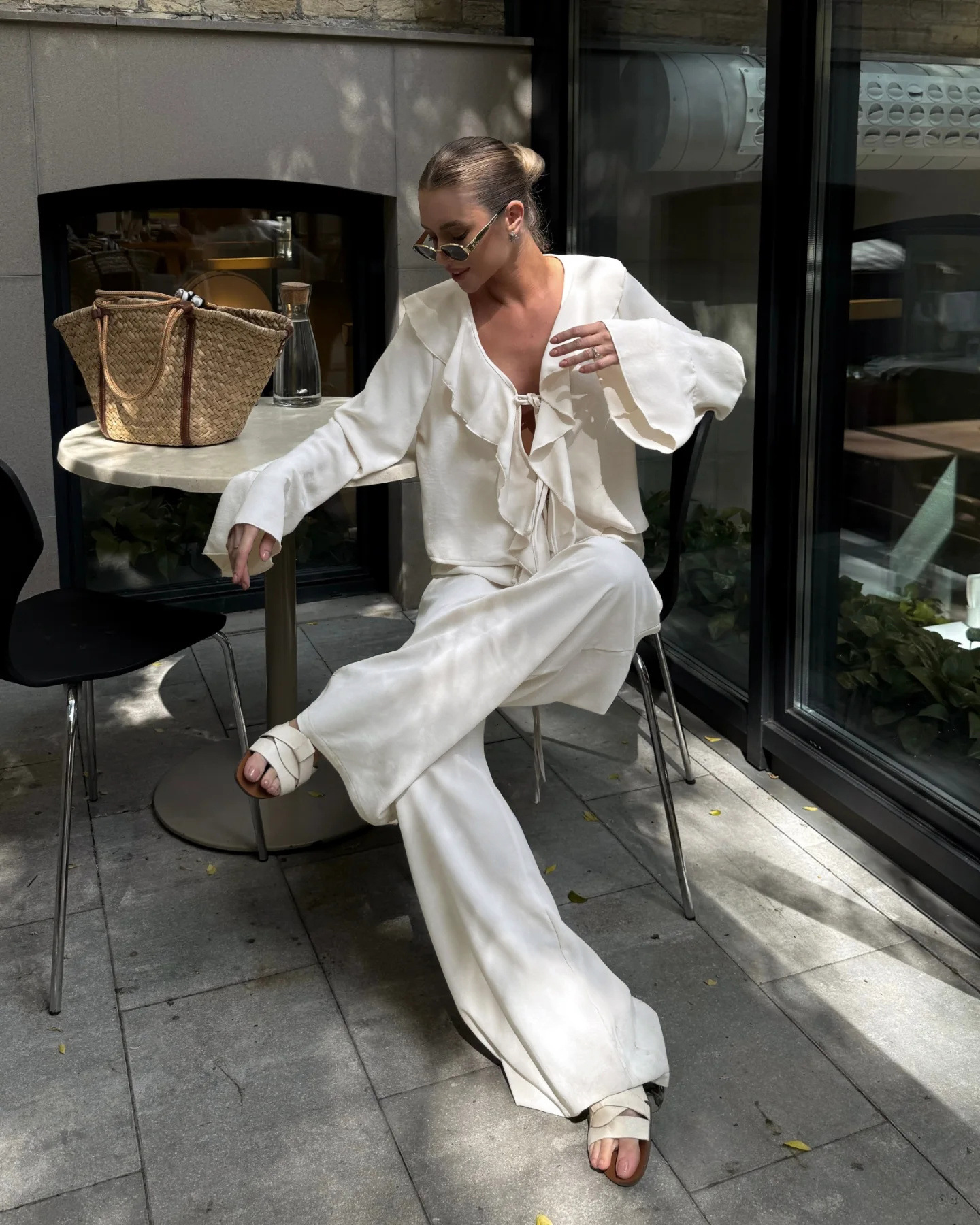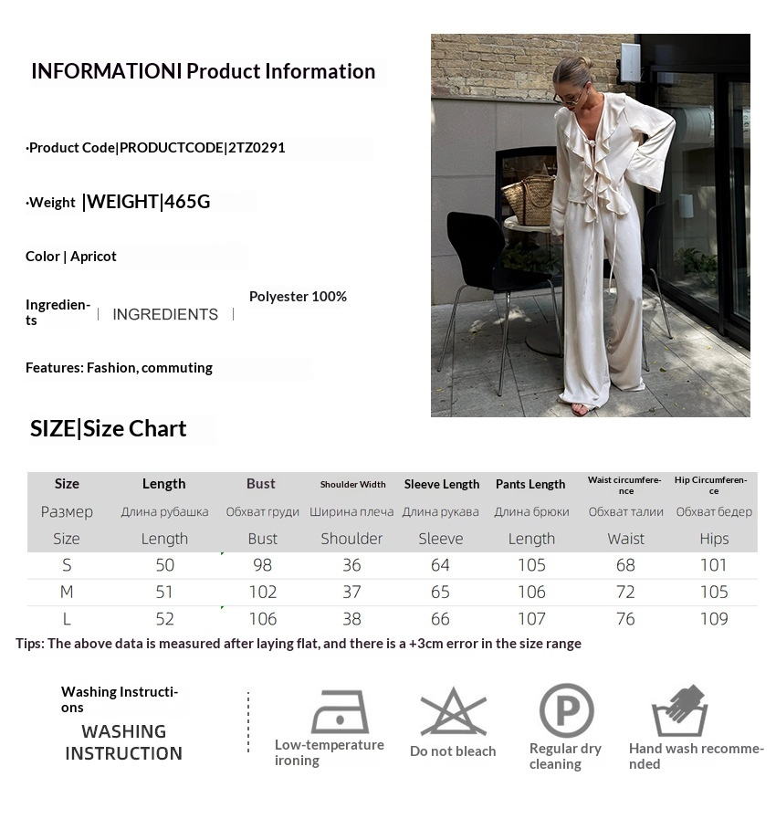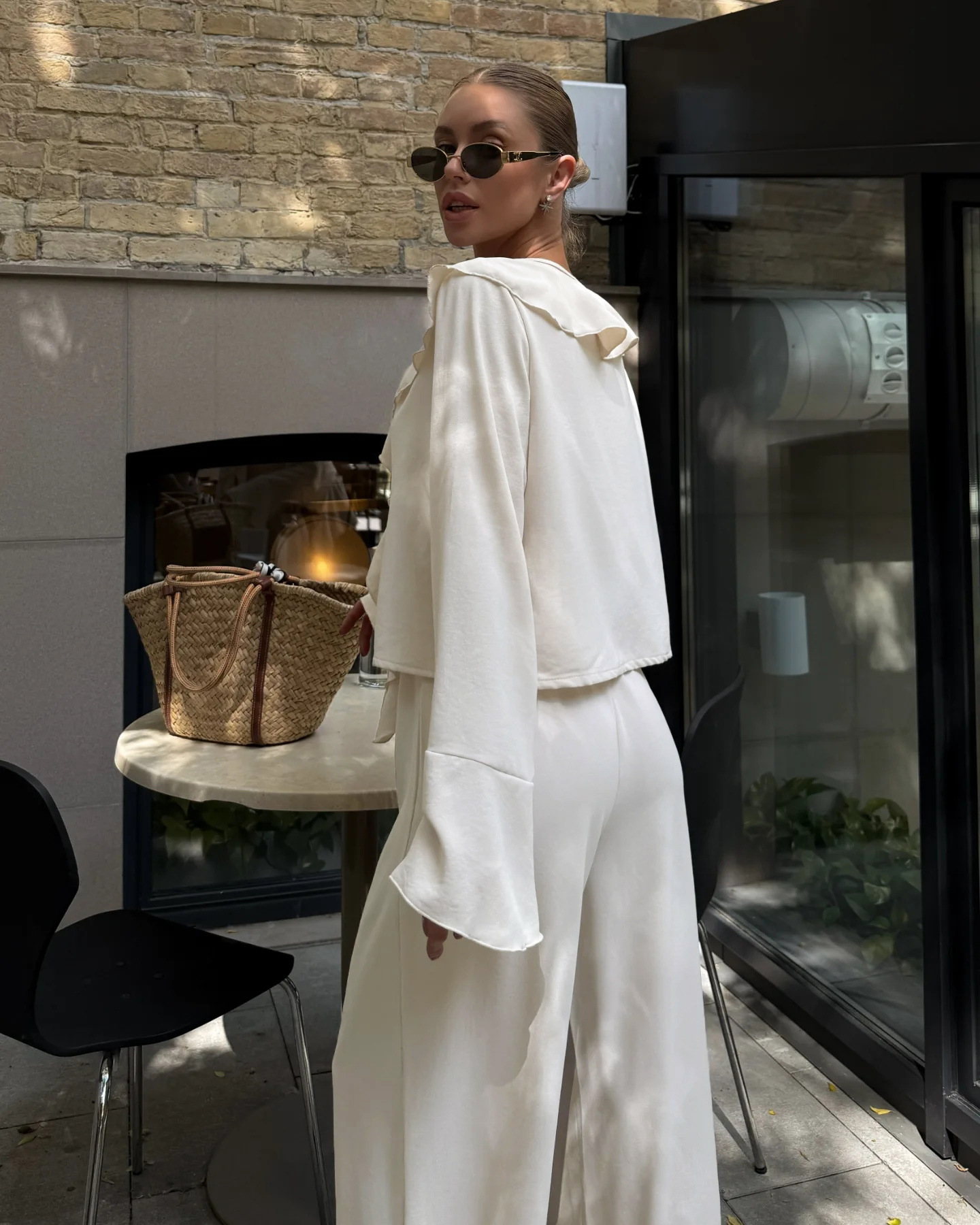 V-neck Ruffled Long-sleeve Shirt And High-waist Wide-leg Pants Two-piece Set Τιμή πώλησης€54,76