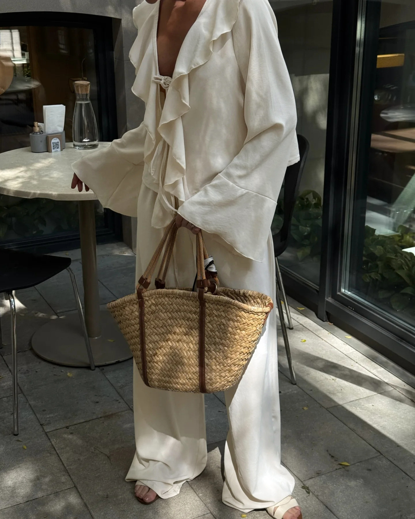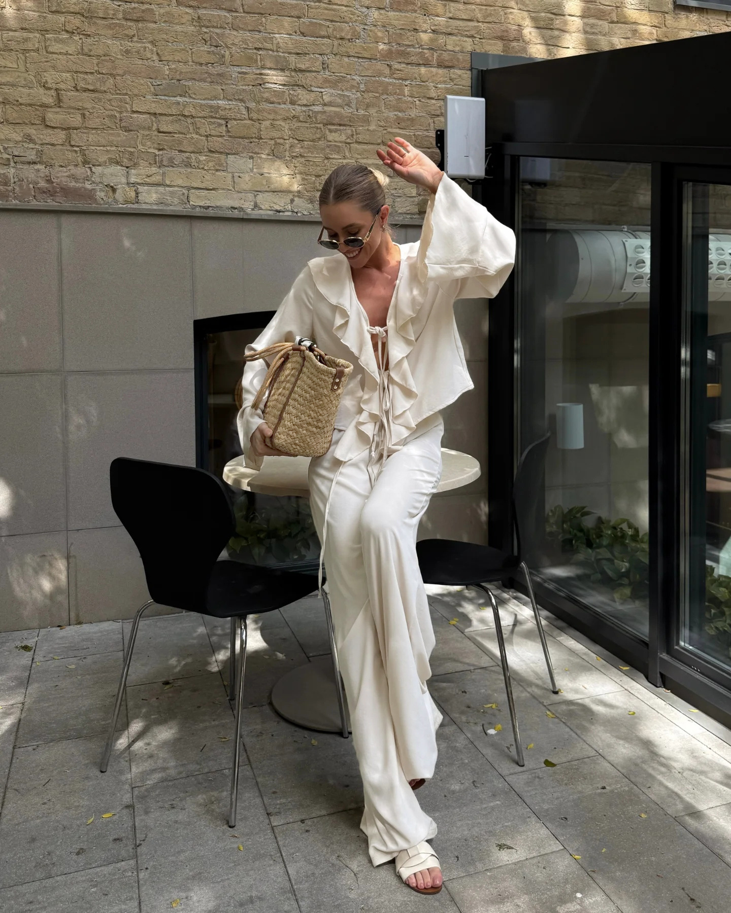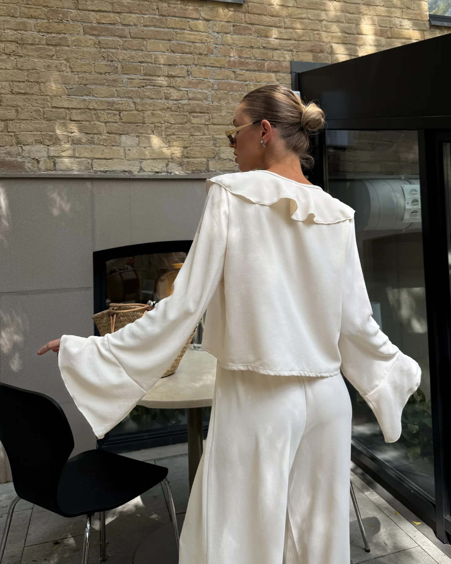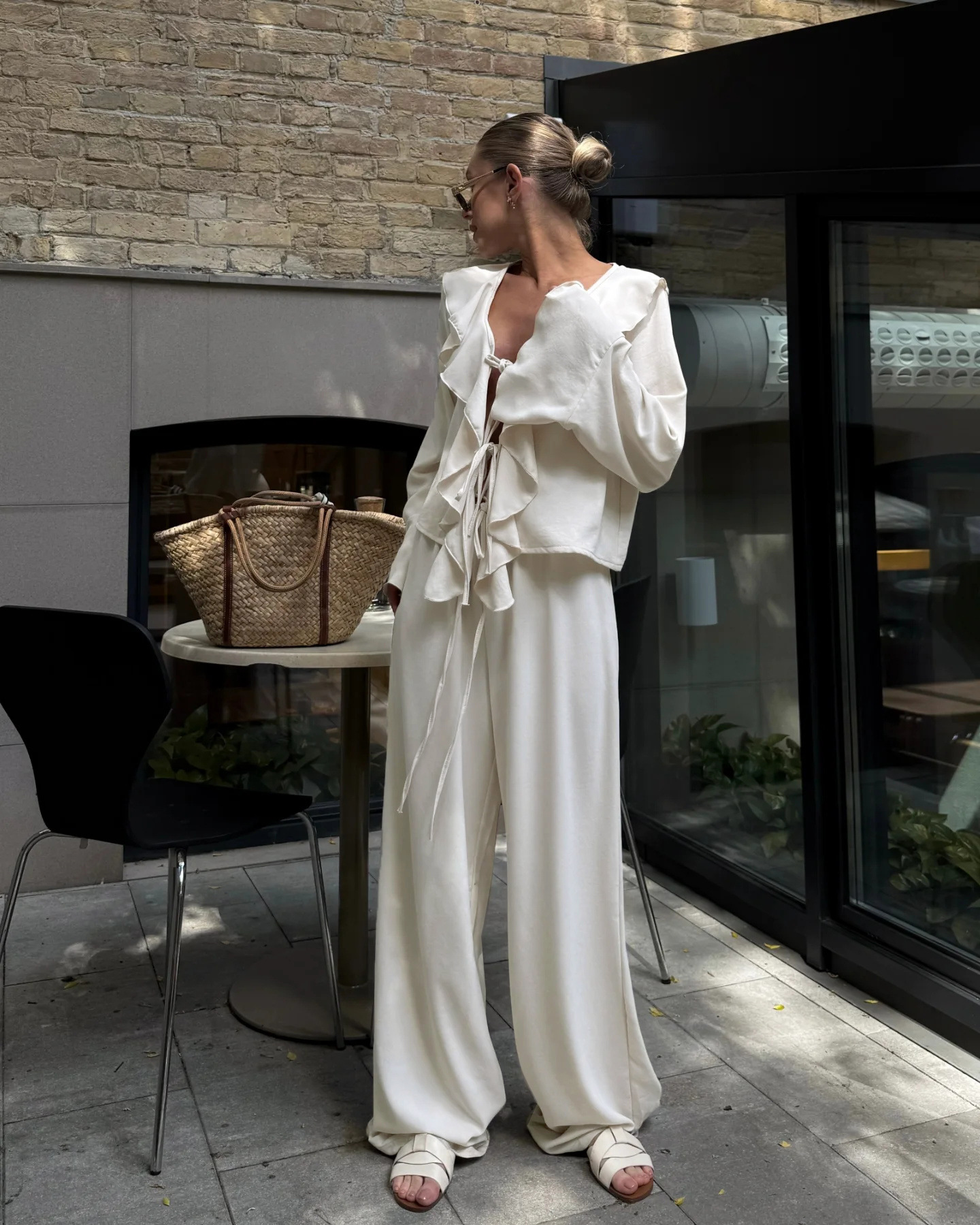 V-neck Ruffled Long-sleeve Shirt And High-waist Wide-leg Pants Two-piece Set Τιμή πώλησης€54,76