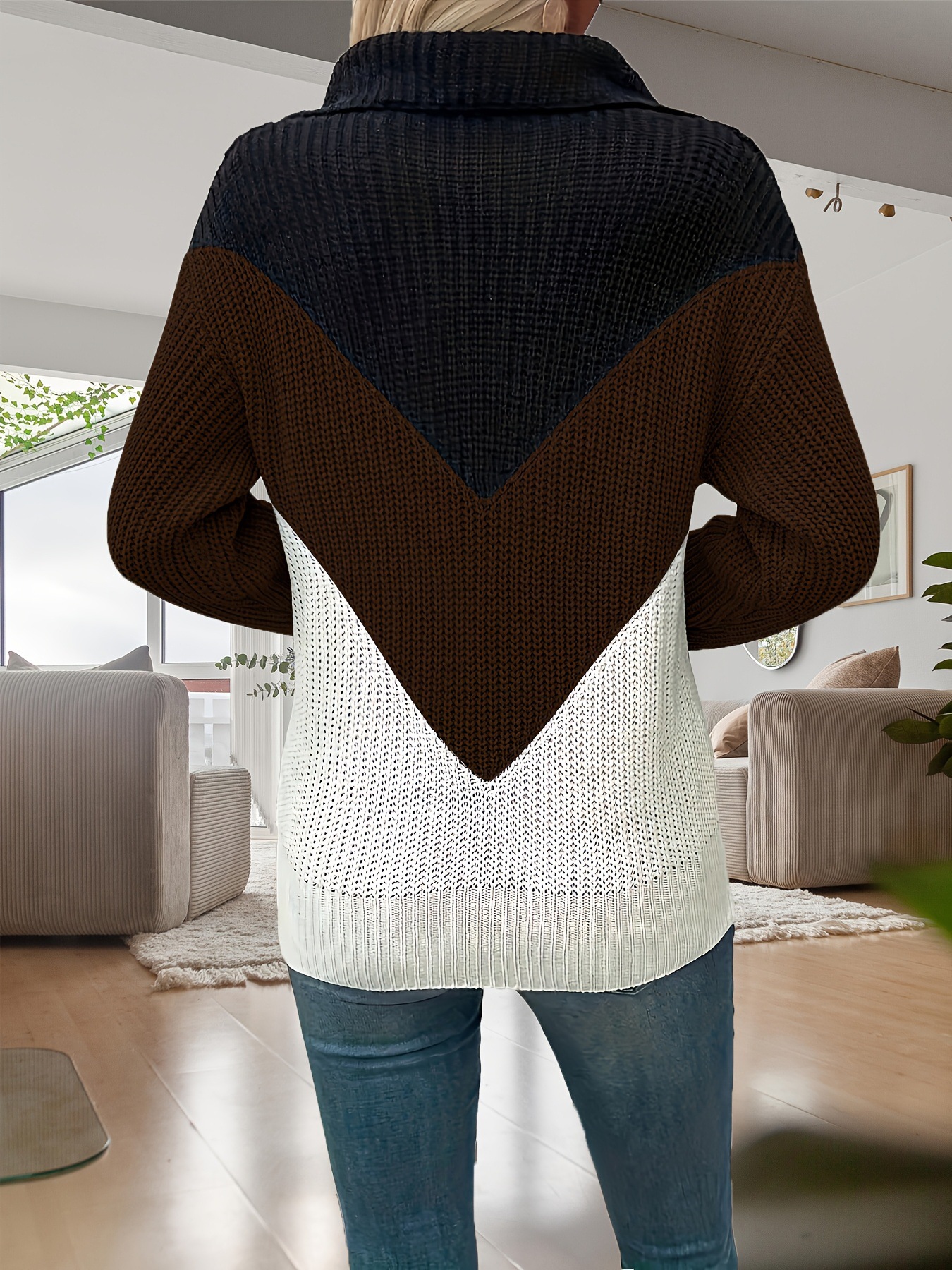 Casual Lapel Contrast-color Long-sleeve Knitted Zip-up Sweater