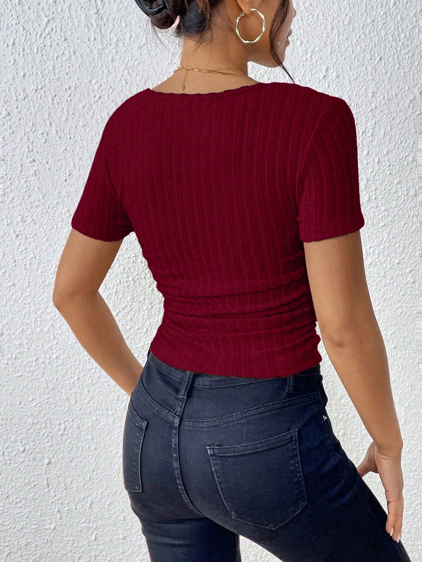 T-shirt With A Mature And Elegant Style Wine-red Short-sleeved Top