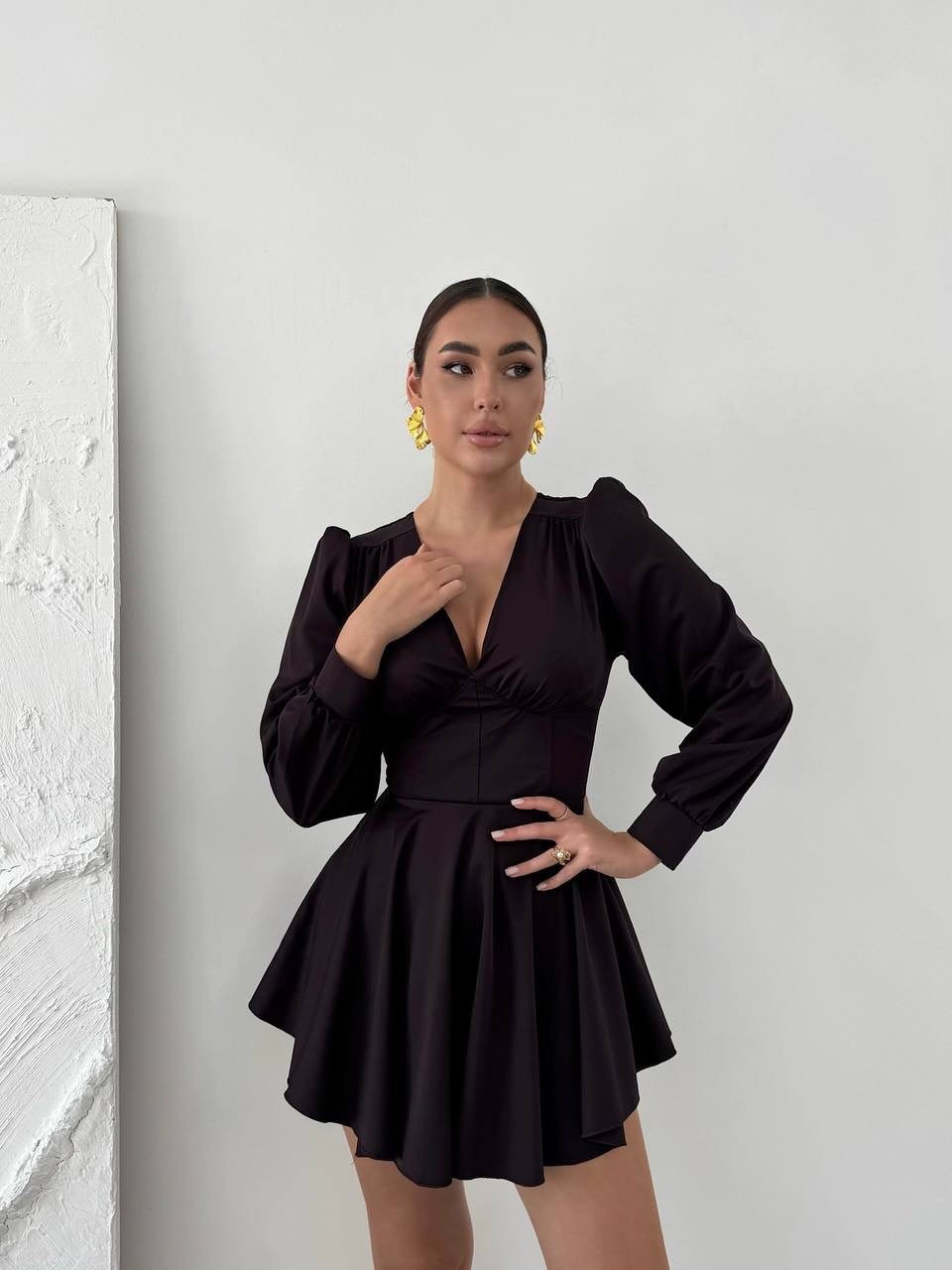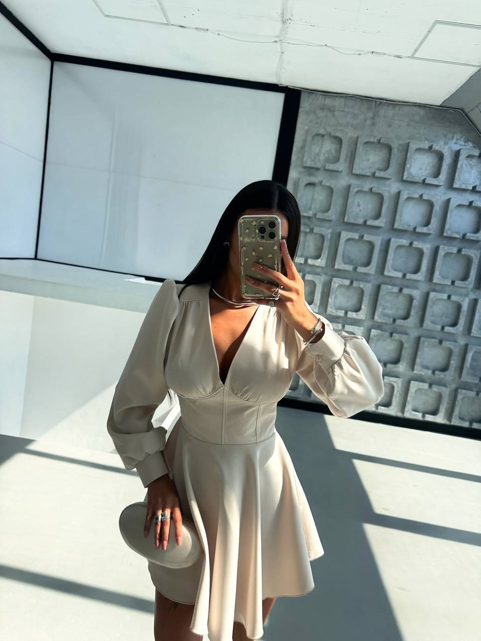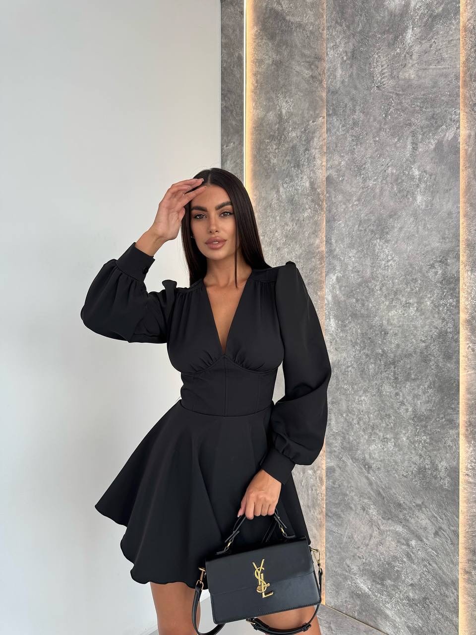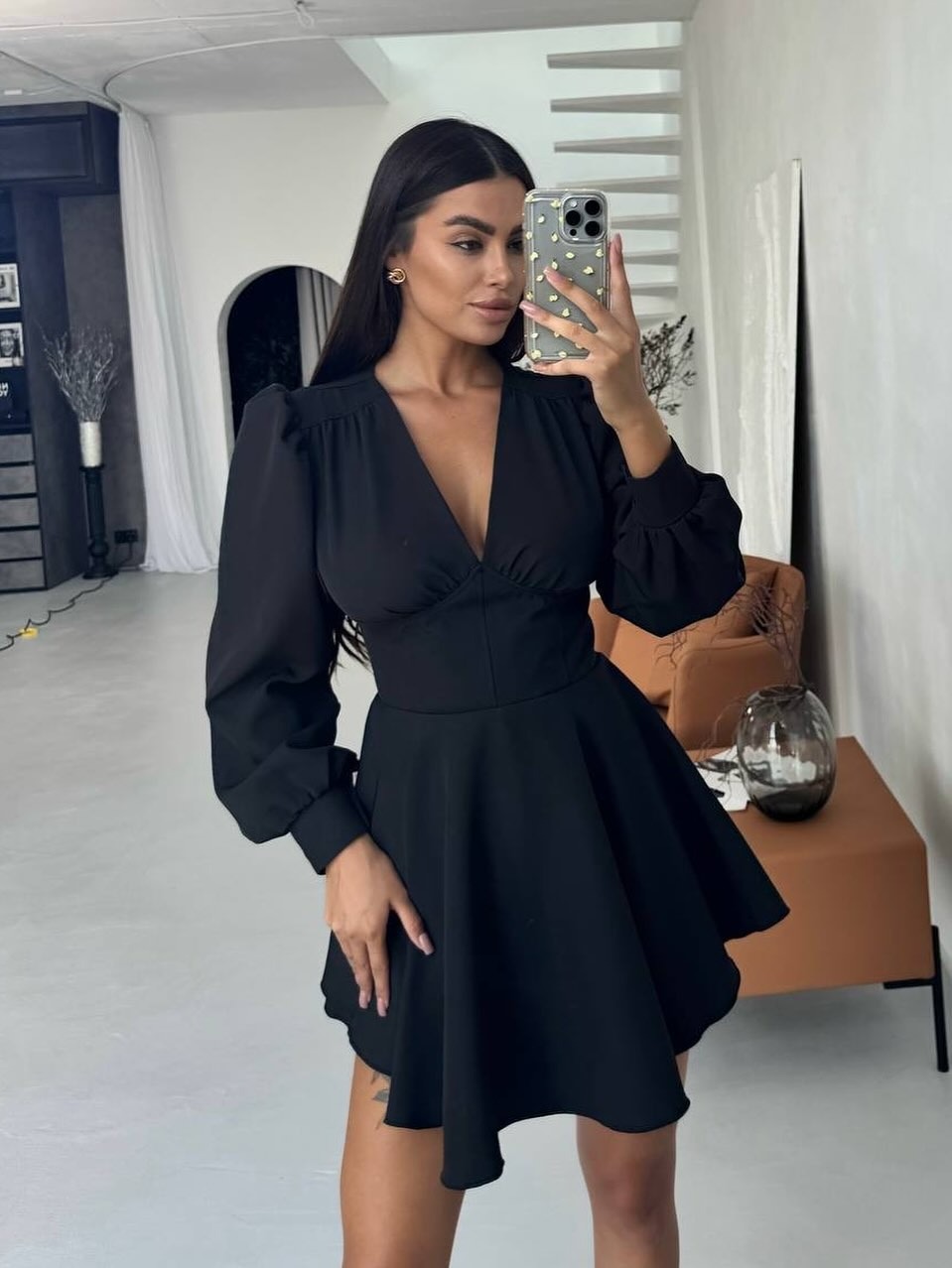 V-neck Puff-sleeve High-waisted A-line Elegant Dress