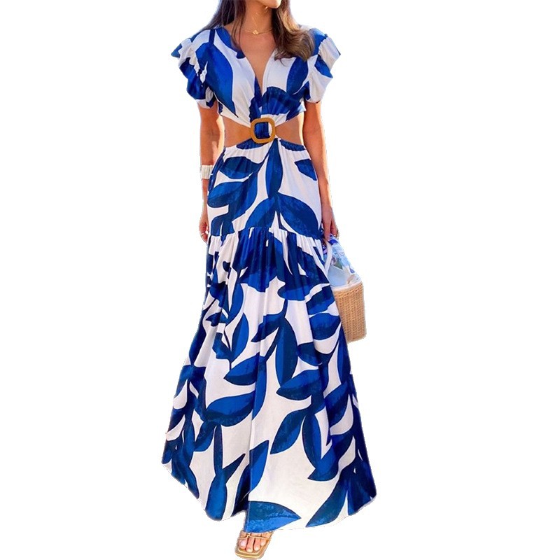 V-neck Ruffle Sleeve Waist Hollow Out Long Dress