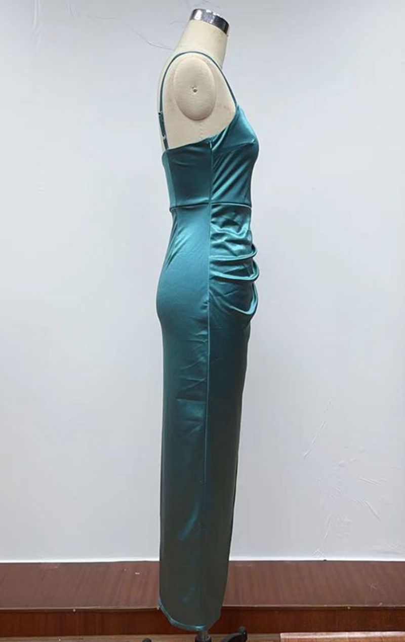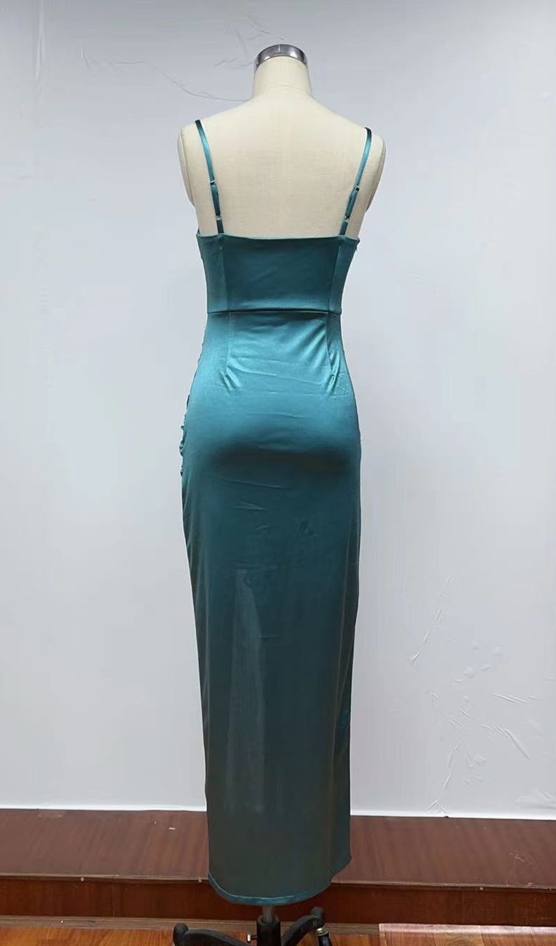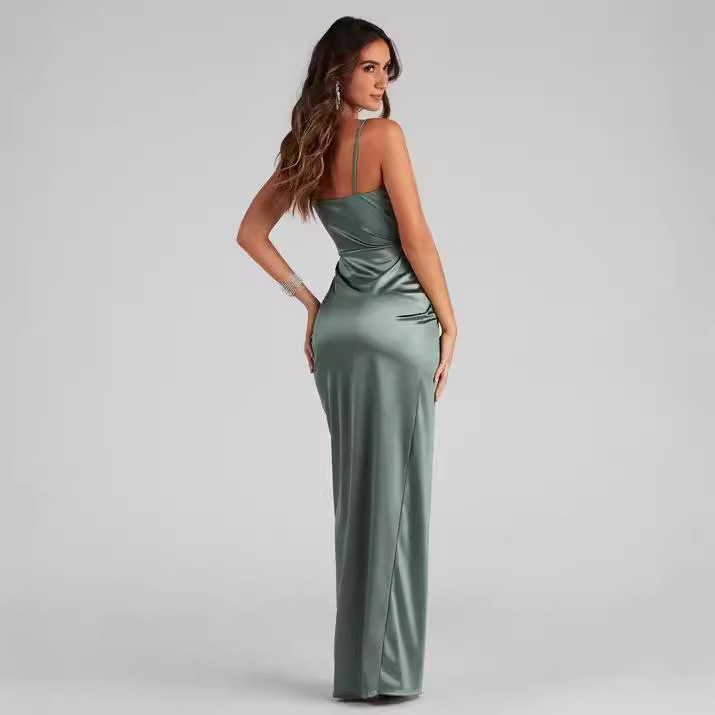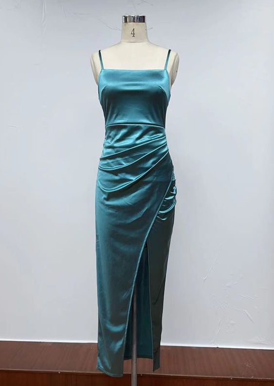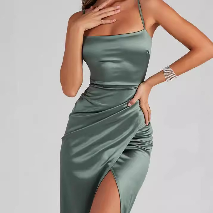 Vestido sexy com ombros expostos, cintura alta, que realça as nádegas e com fenda.