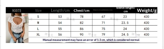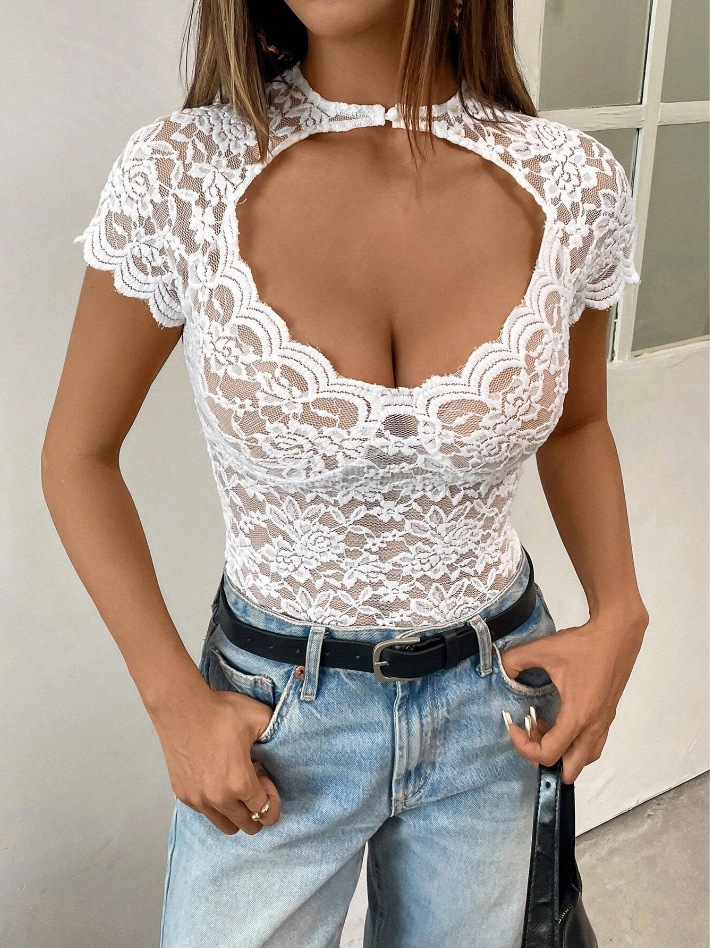 Alluring Lace Sexy Hollow-Out Pullover Elegant Slim-Fit Solid-Color Short-Sleeve Top