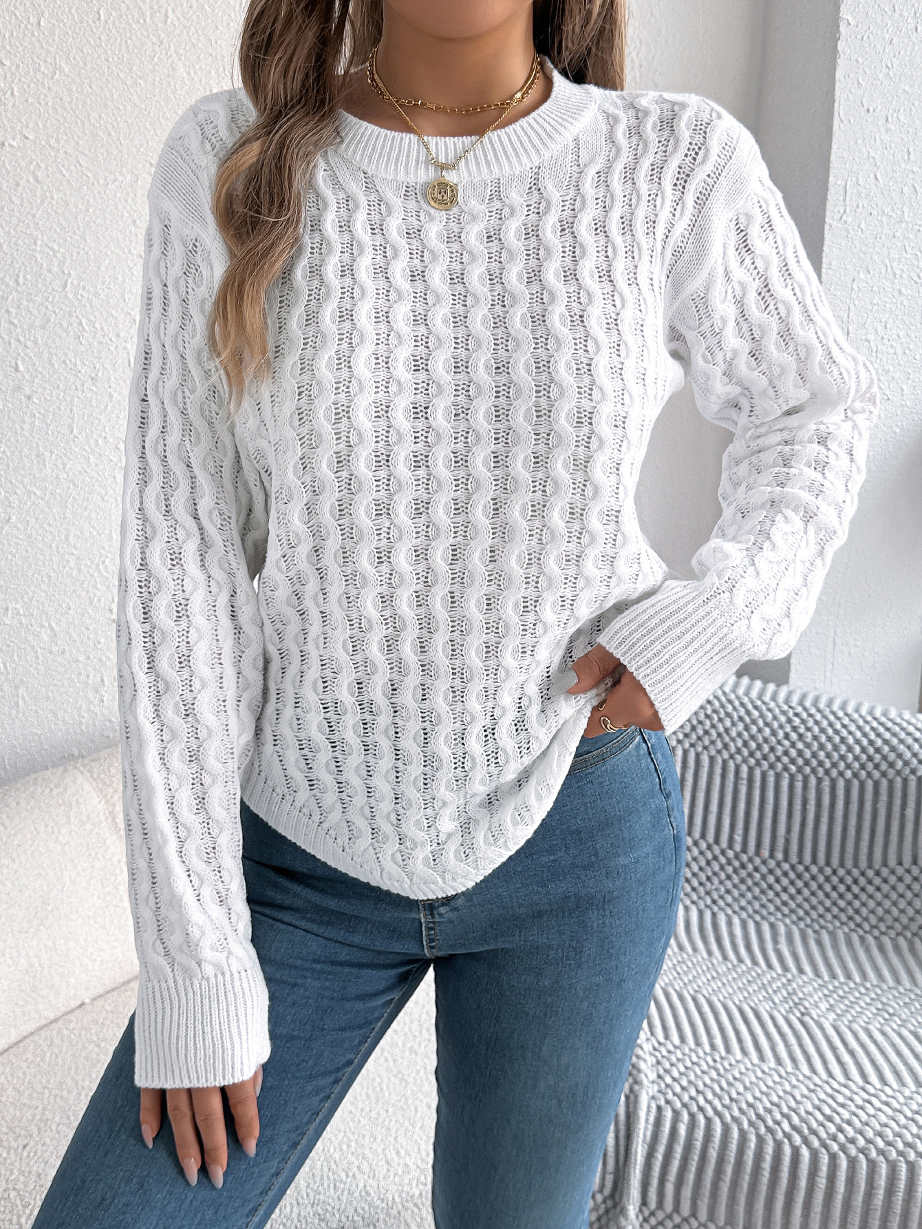Women Casual Solid Color Cable Knit Lantern Sleeve Irregular Pullover Sweater
