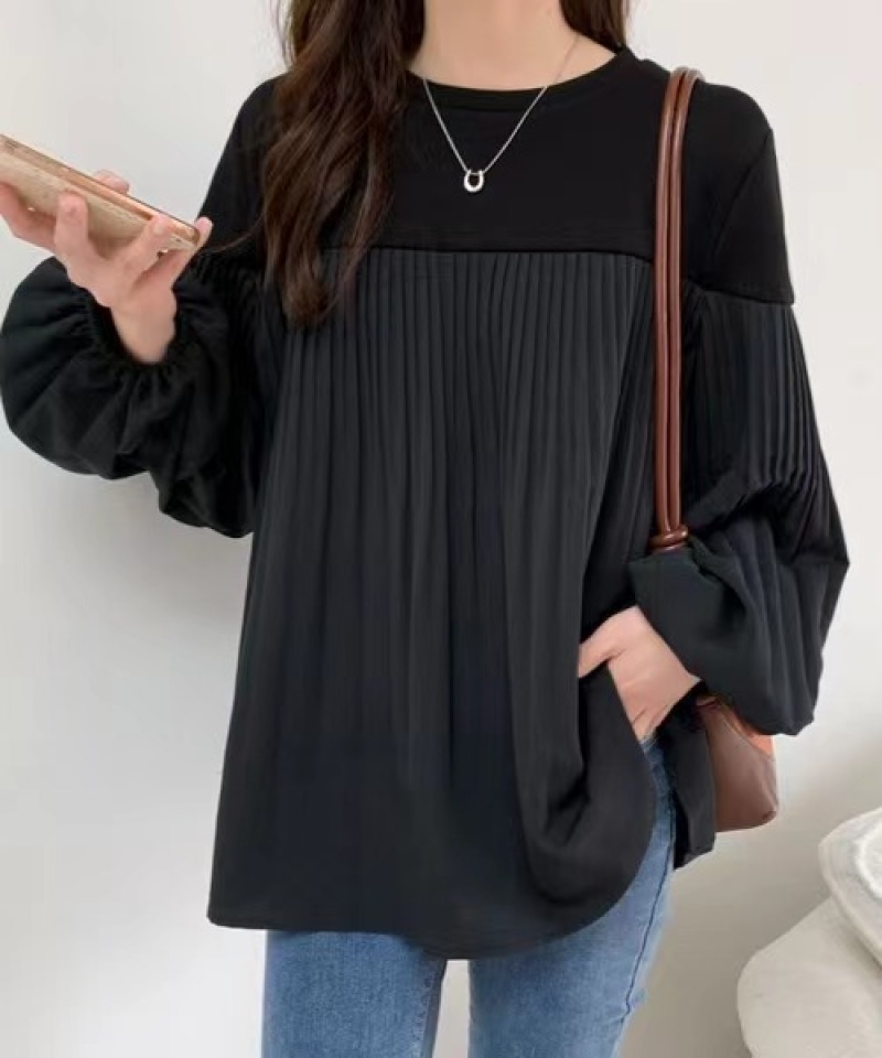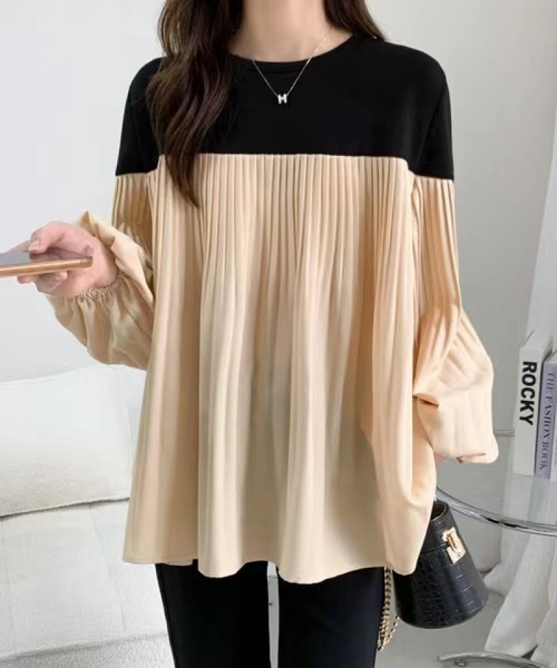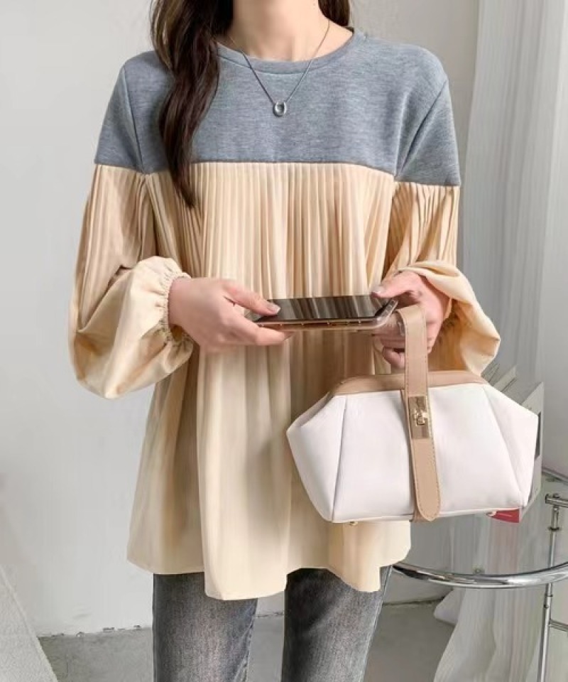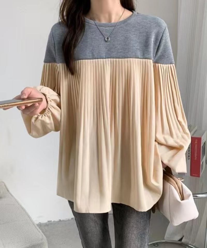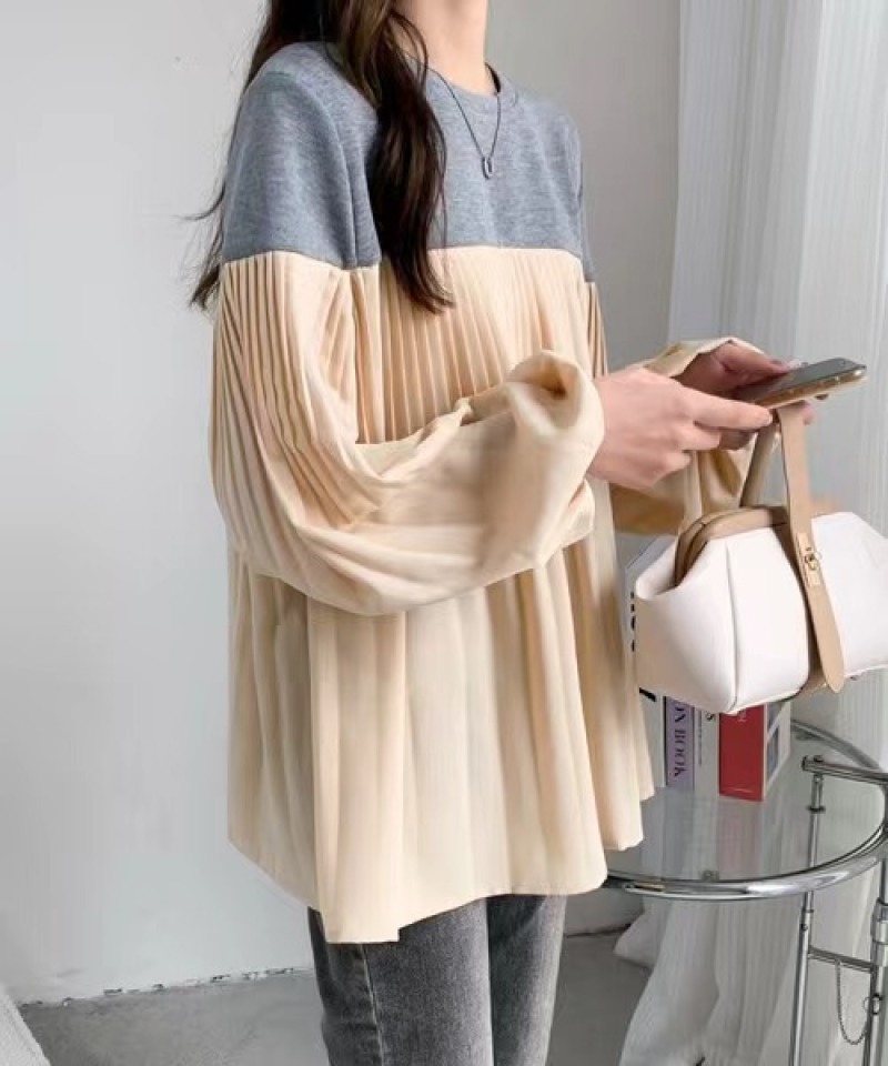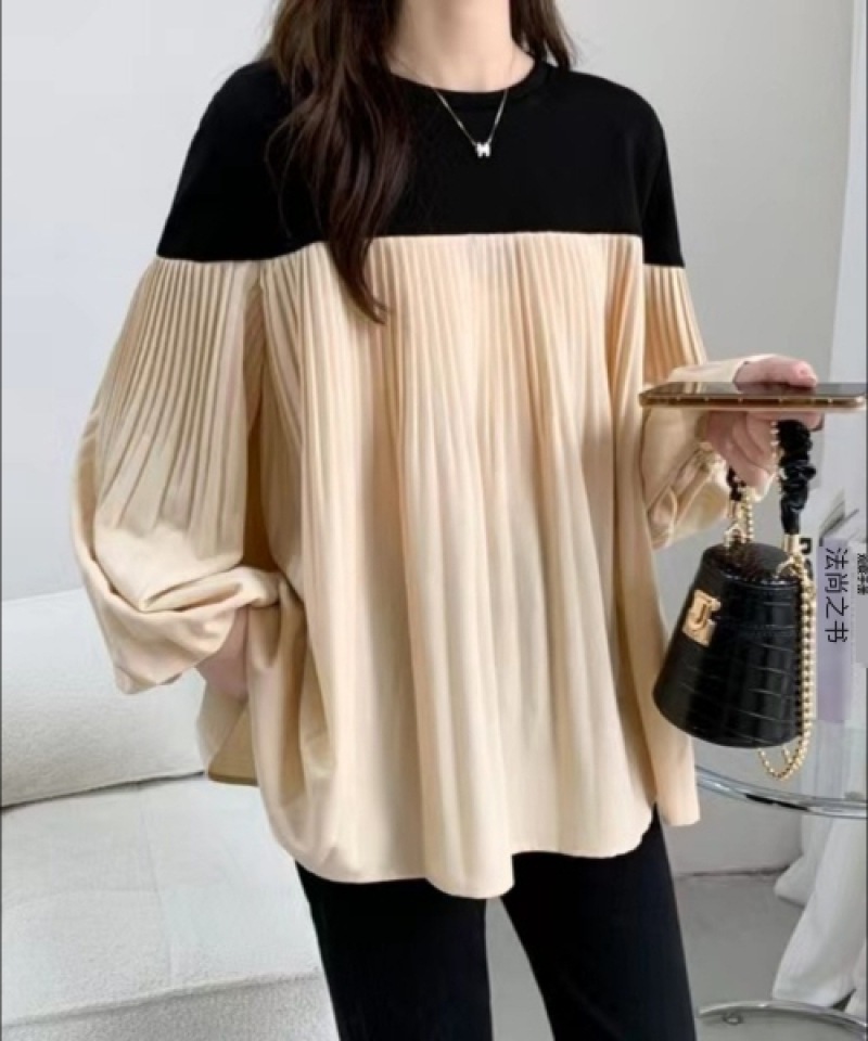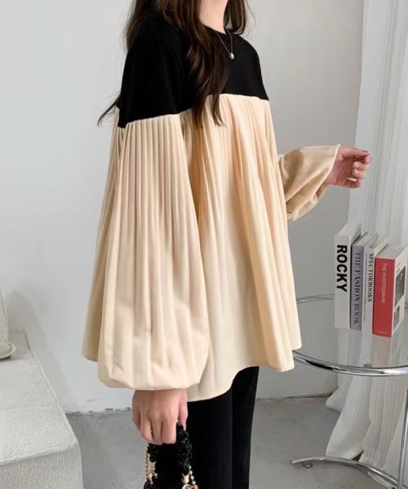 Elastic Lantern Sleeve Round Neck Contrast Color Pleated Long Sleeve Sweater