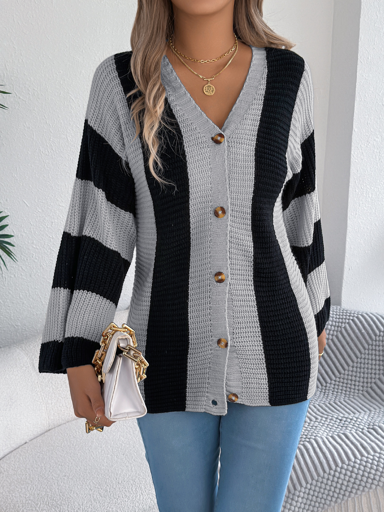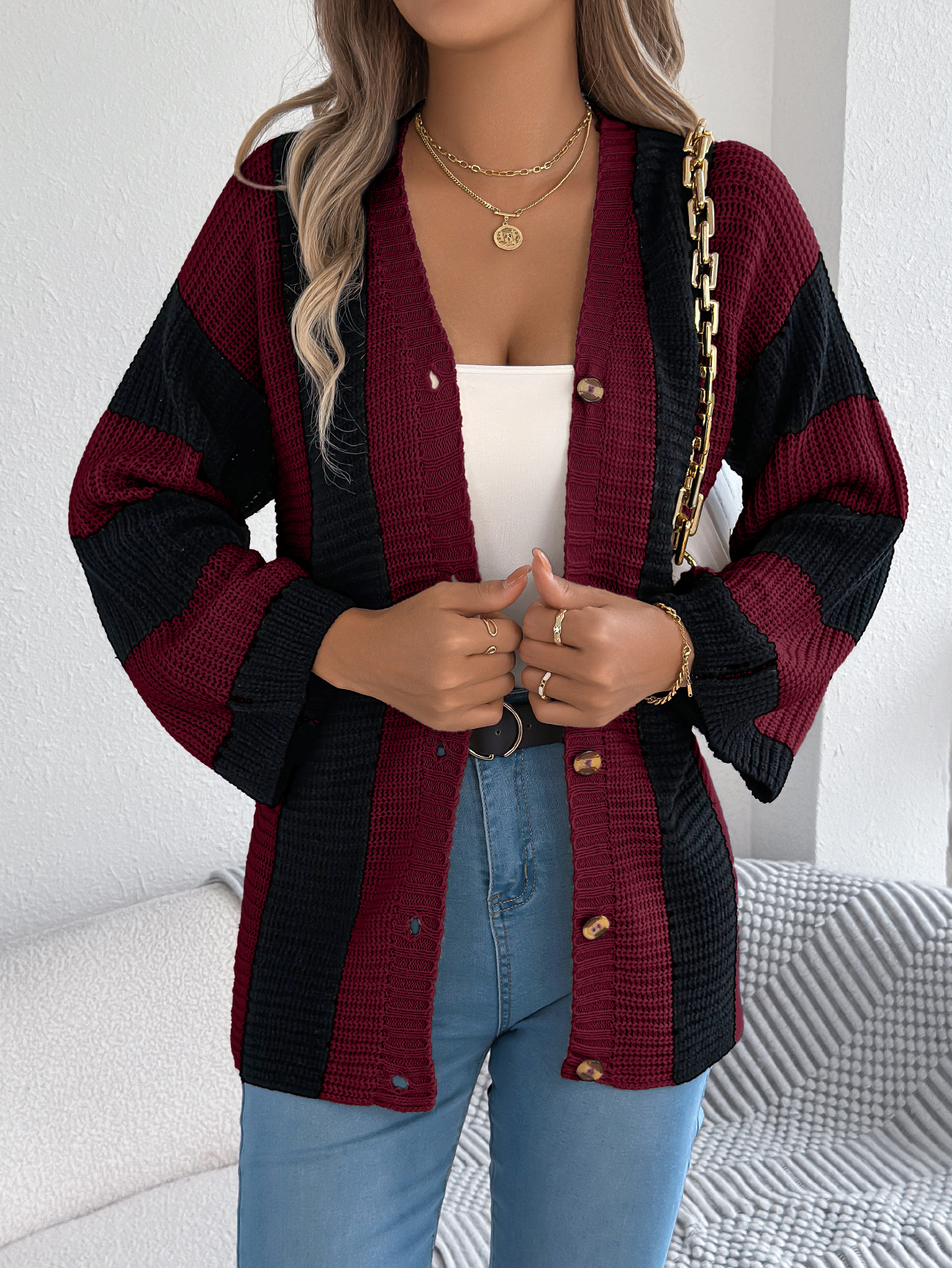 Women Color Block Stripe Bell Sleeve Long Sleeve Cardigan Sweater Coat