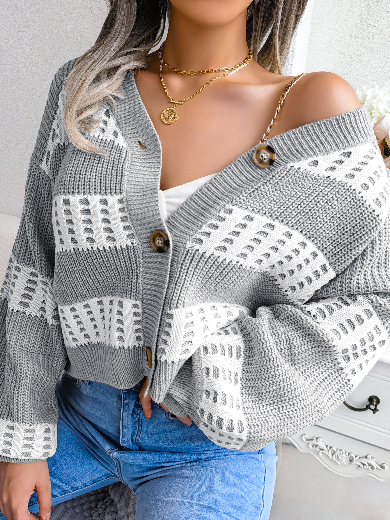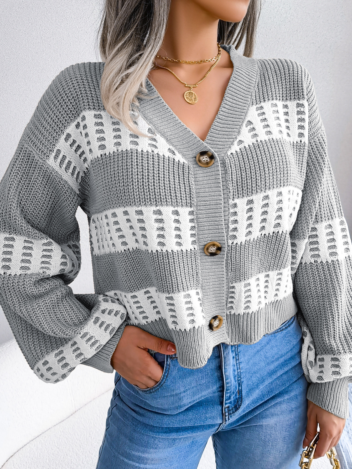 Women Designer Color Block Lantern Sleeve Cardigan Sweater Coat