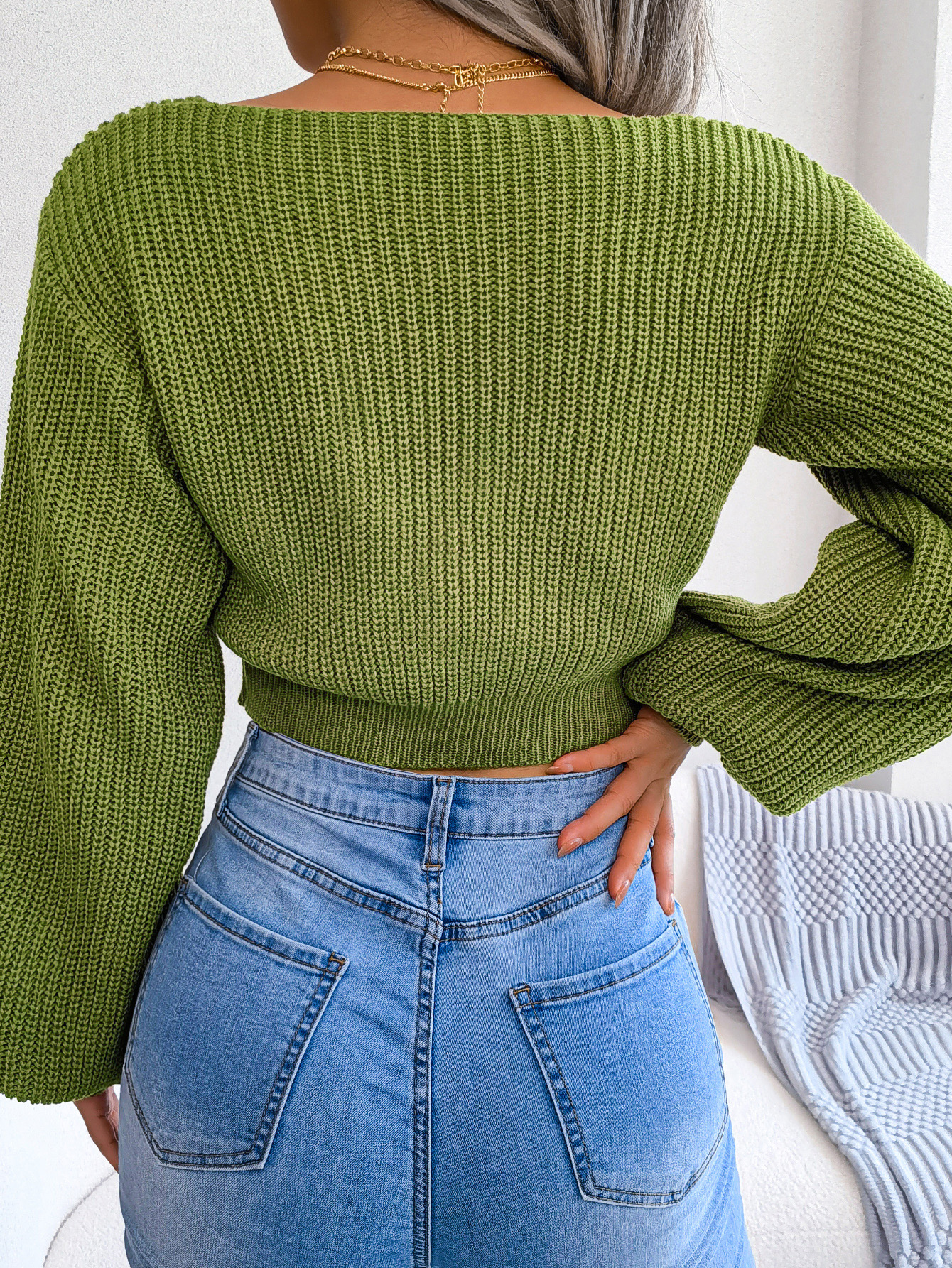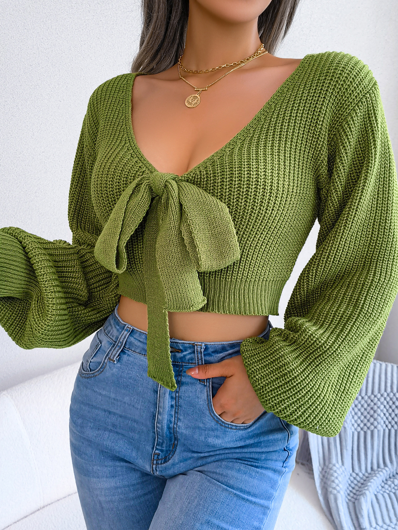 Women Fashion Bow V-Neck Lantern Sleeve Cropped Sweater