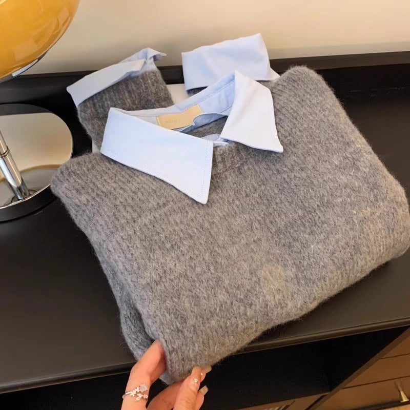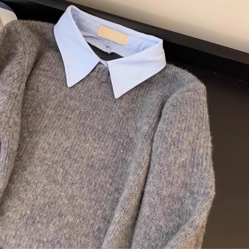 Women's Elegant Fake Two-Piece Sweater, Collared Long Sleeve Pullover with Button Detail for Versatile Layering