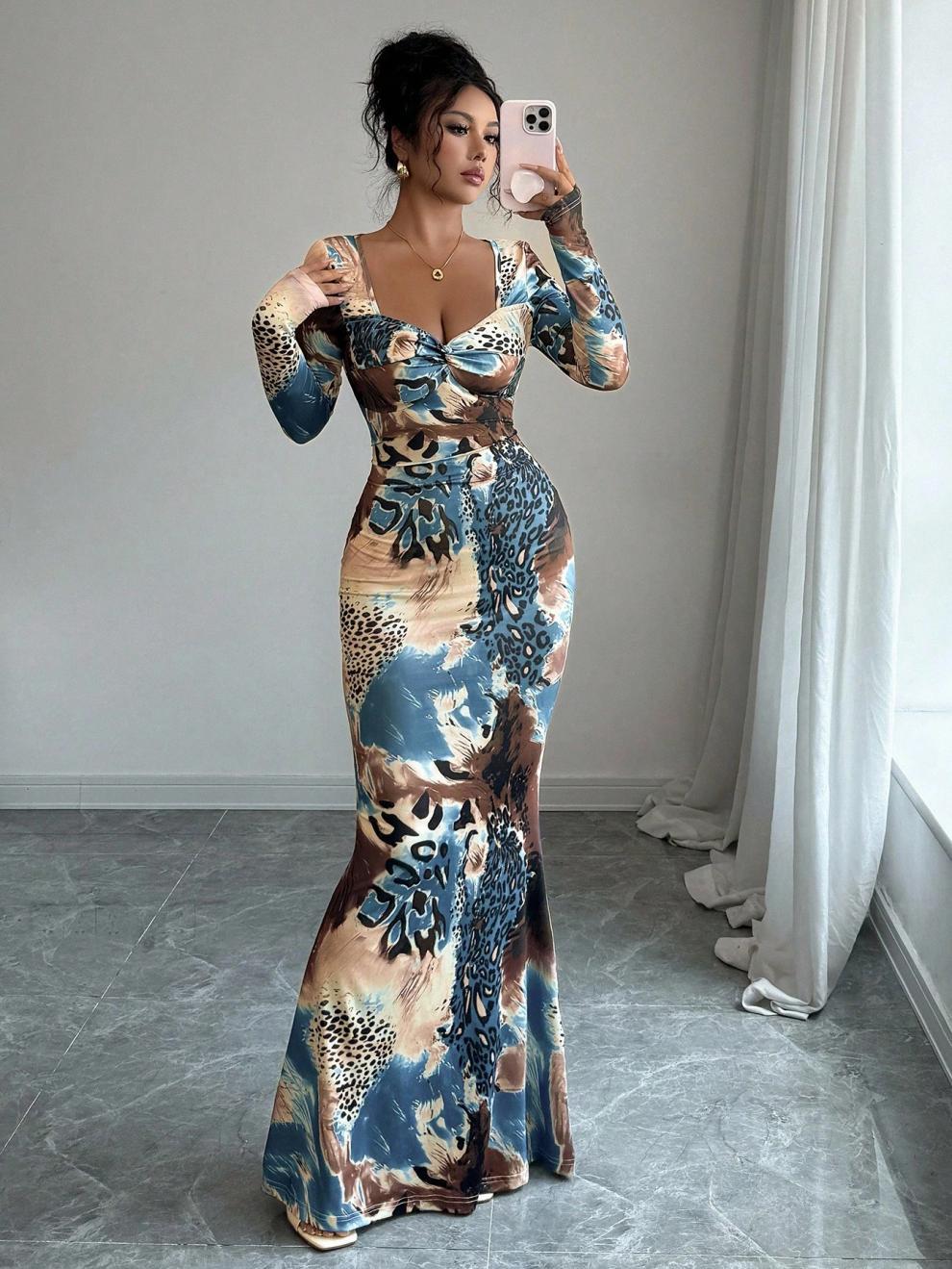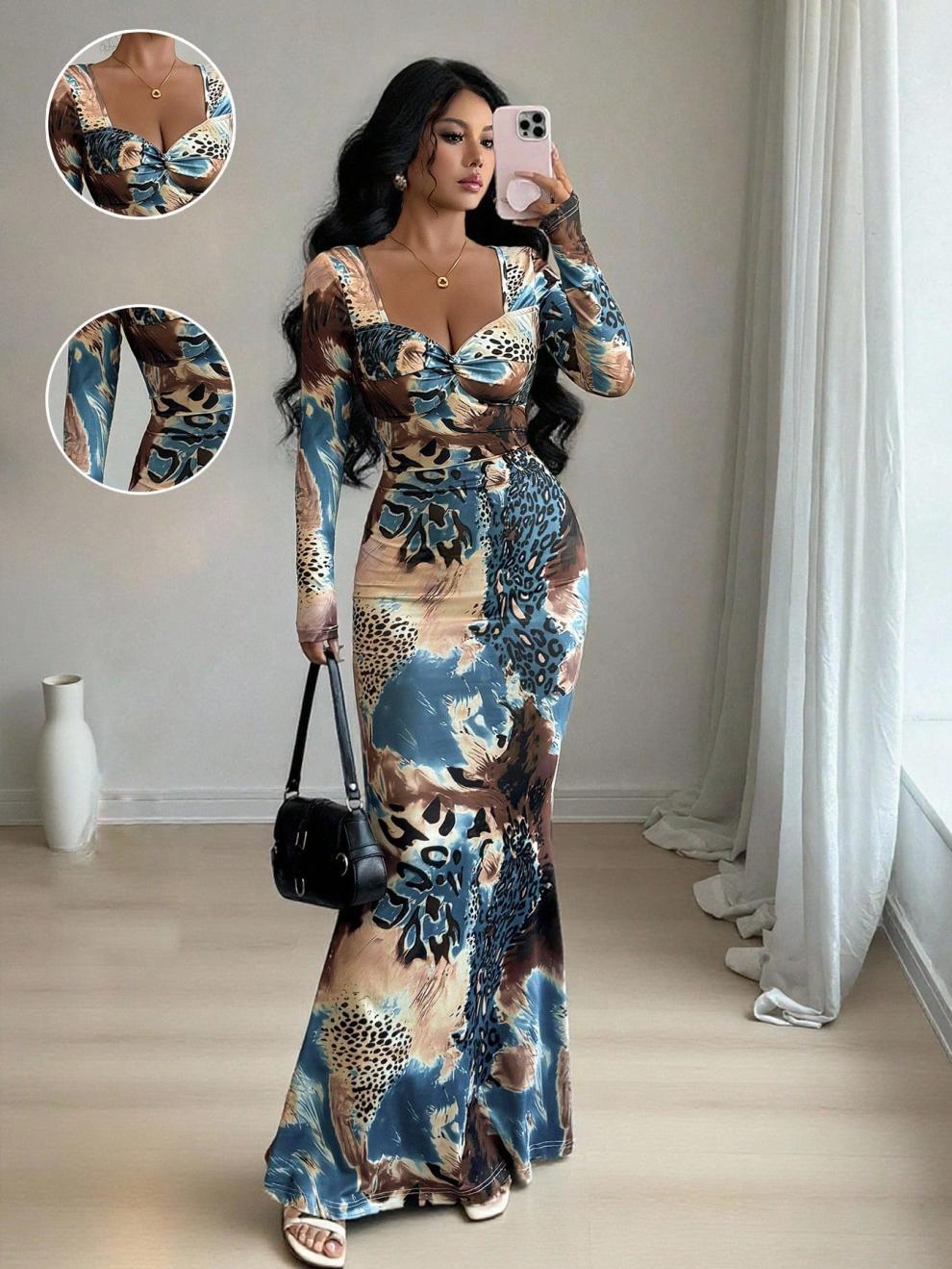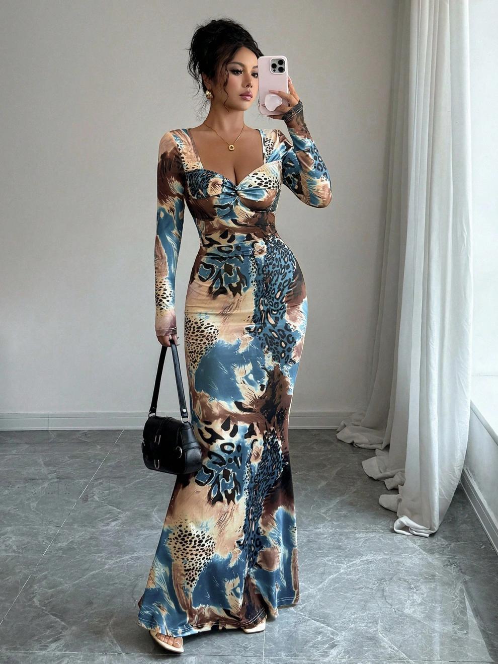 Long-sleeved Printed Dress With A Tie-front Design At The Chest