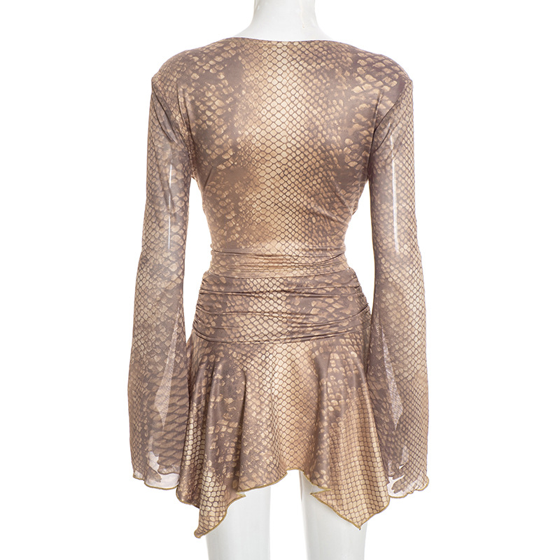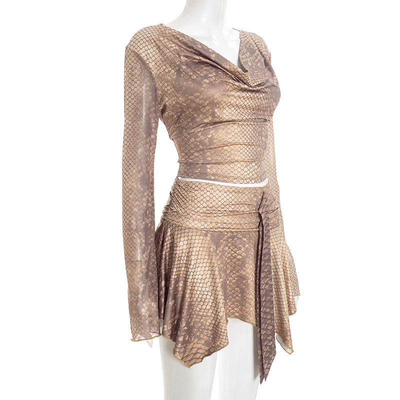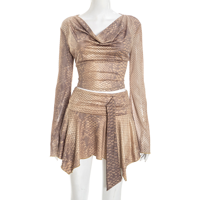 Womens V-neck Long-sleeve Asymmetrical Mini Skirt Casual Set