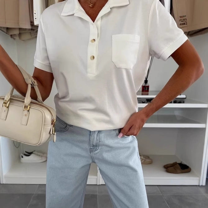 Women's Polo Collar Solid Color Pocket Short Sleeve T-shirt