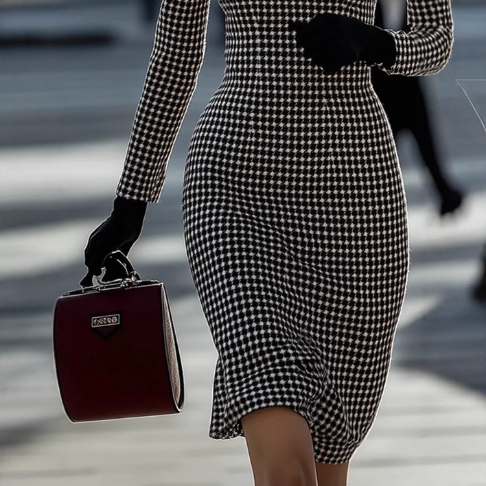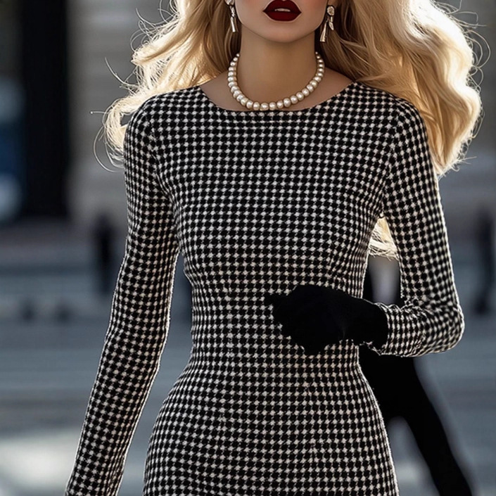 Womens Retro Elegant High-End Round-Neck Houndstooth Dress