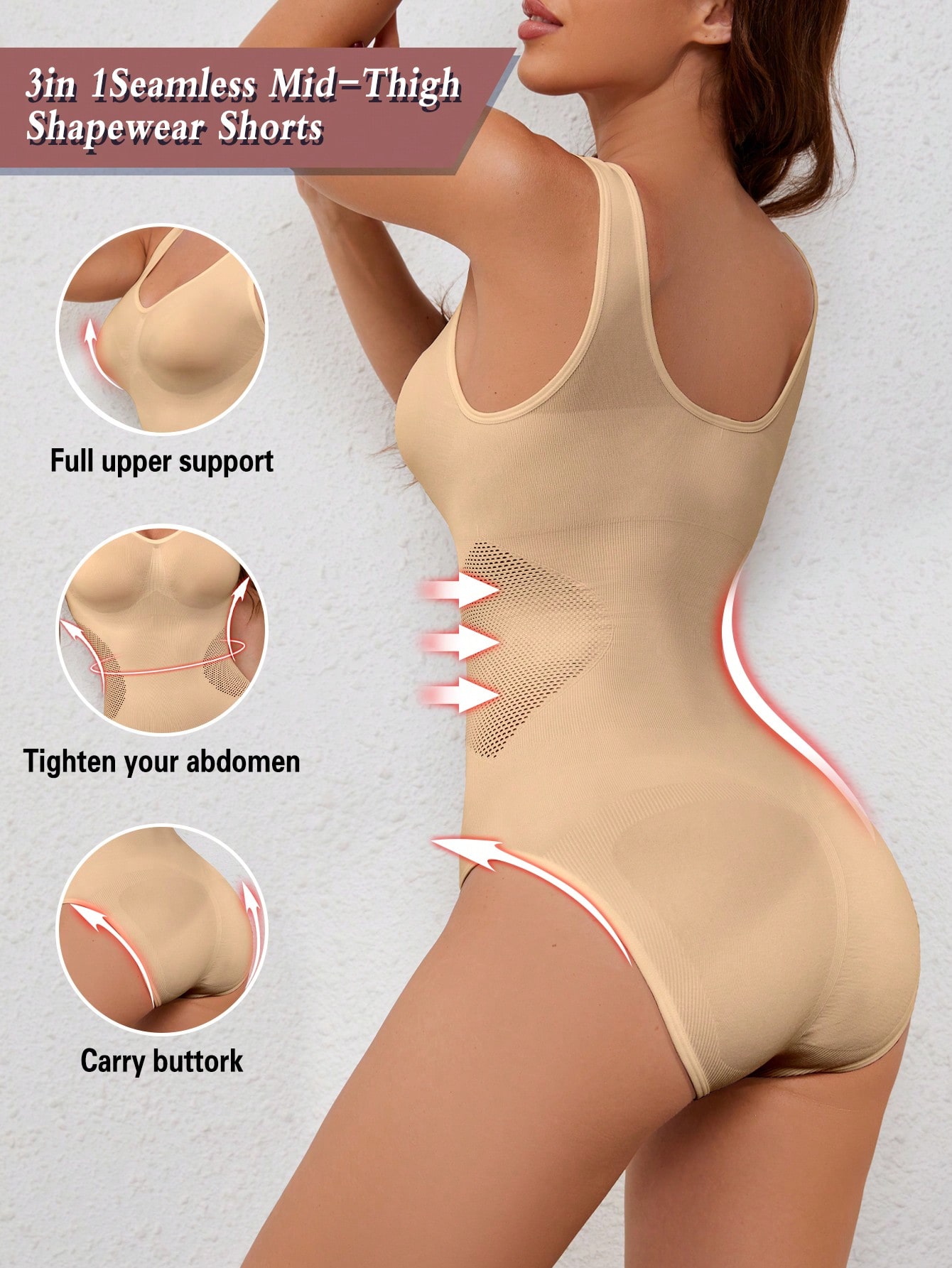 3-in-1 Seamless Mid-Thigh Shapewear Bodysuit Full Upper Support Tummy Control Butt Lift