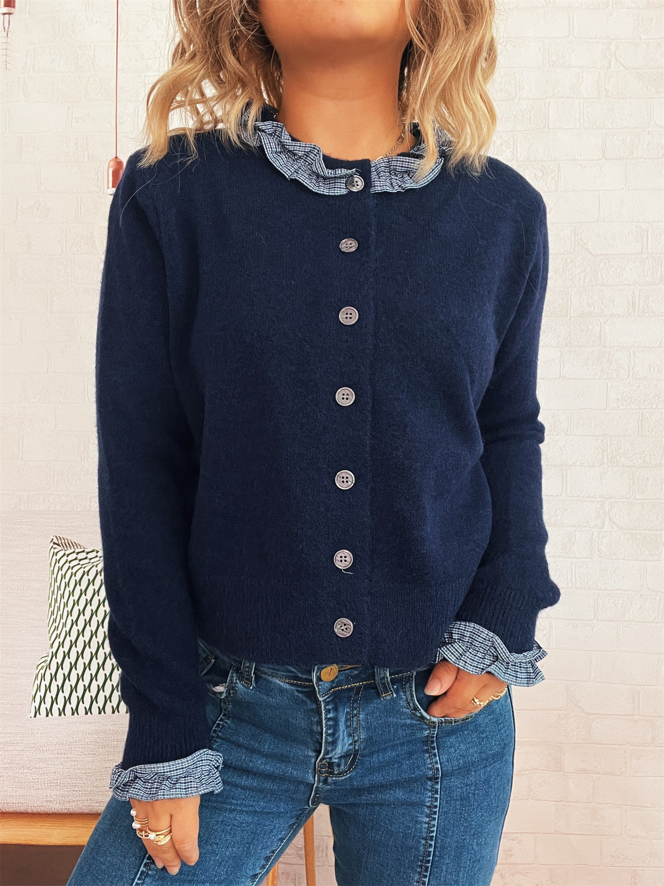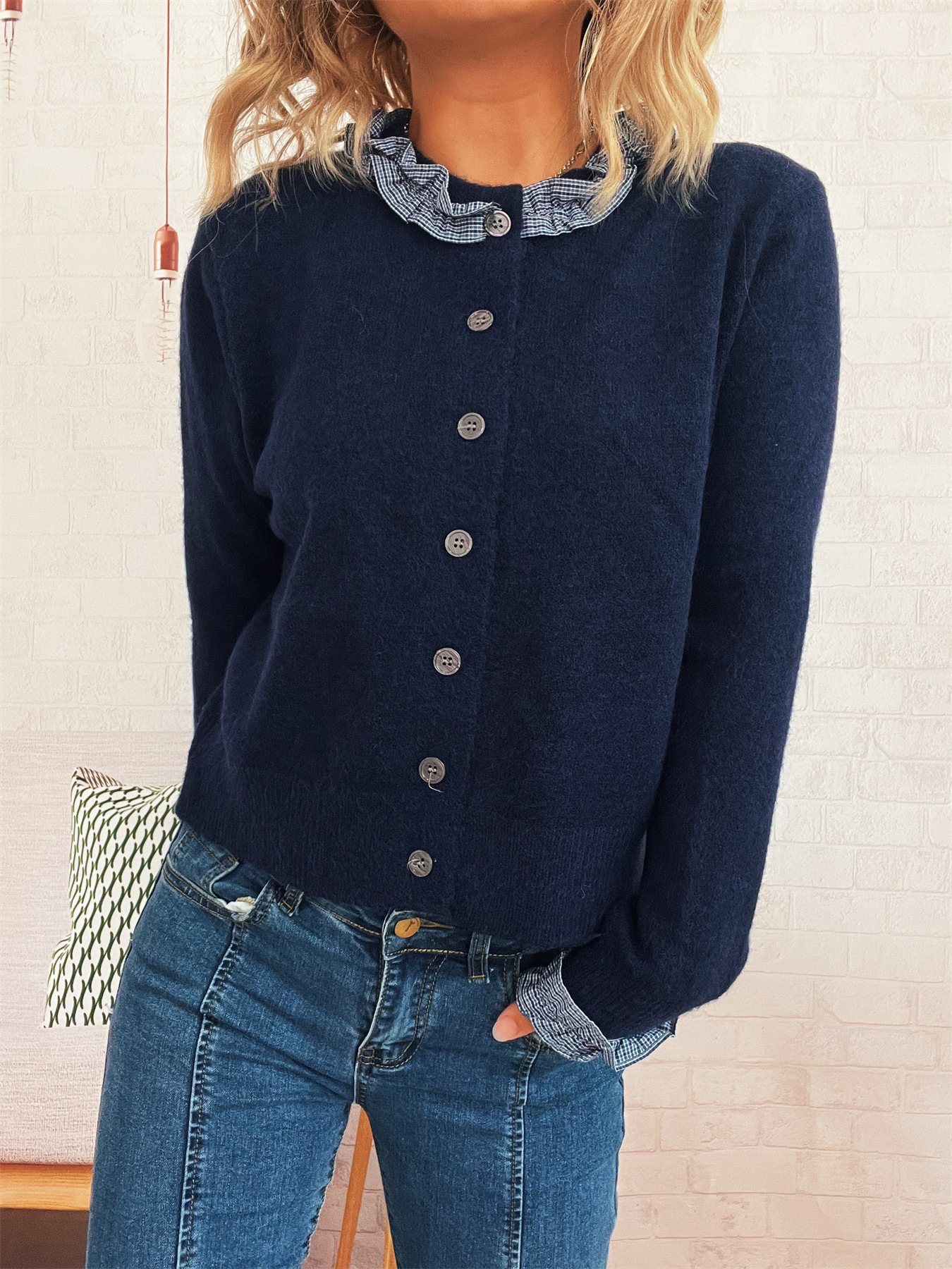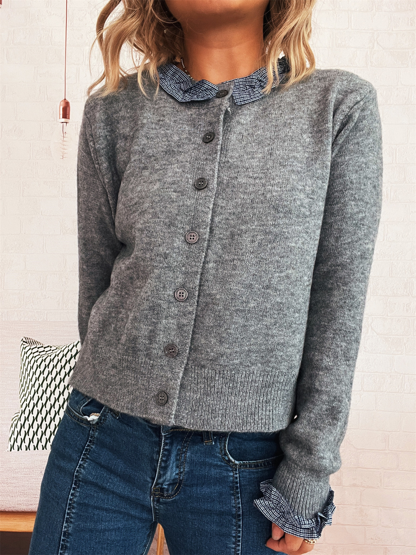 Lace Stitching Single-breasted Long Sleeve Solid Color Slim Fit Sweater