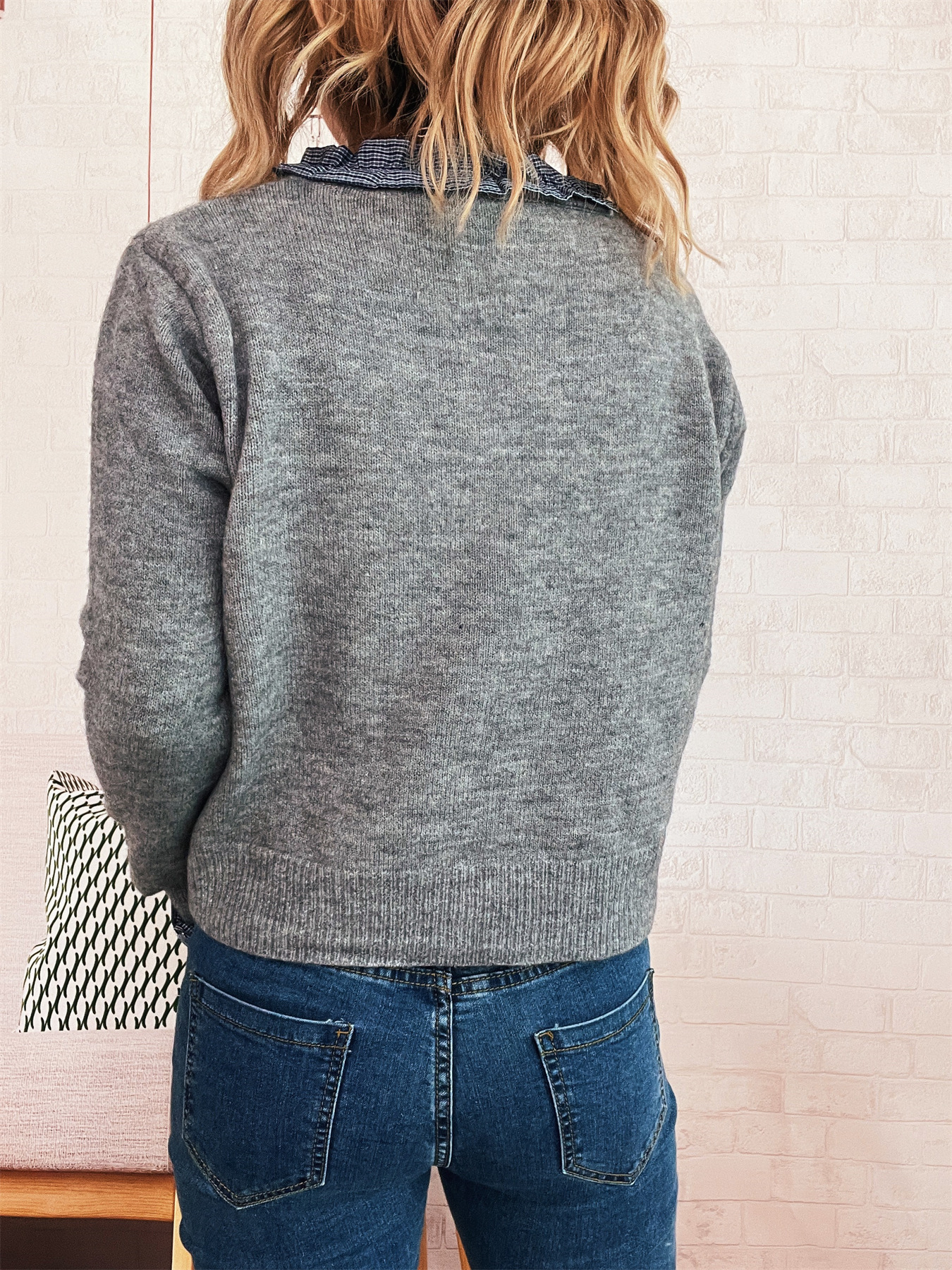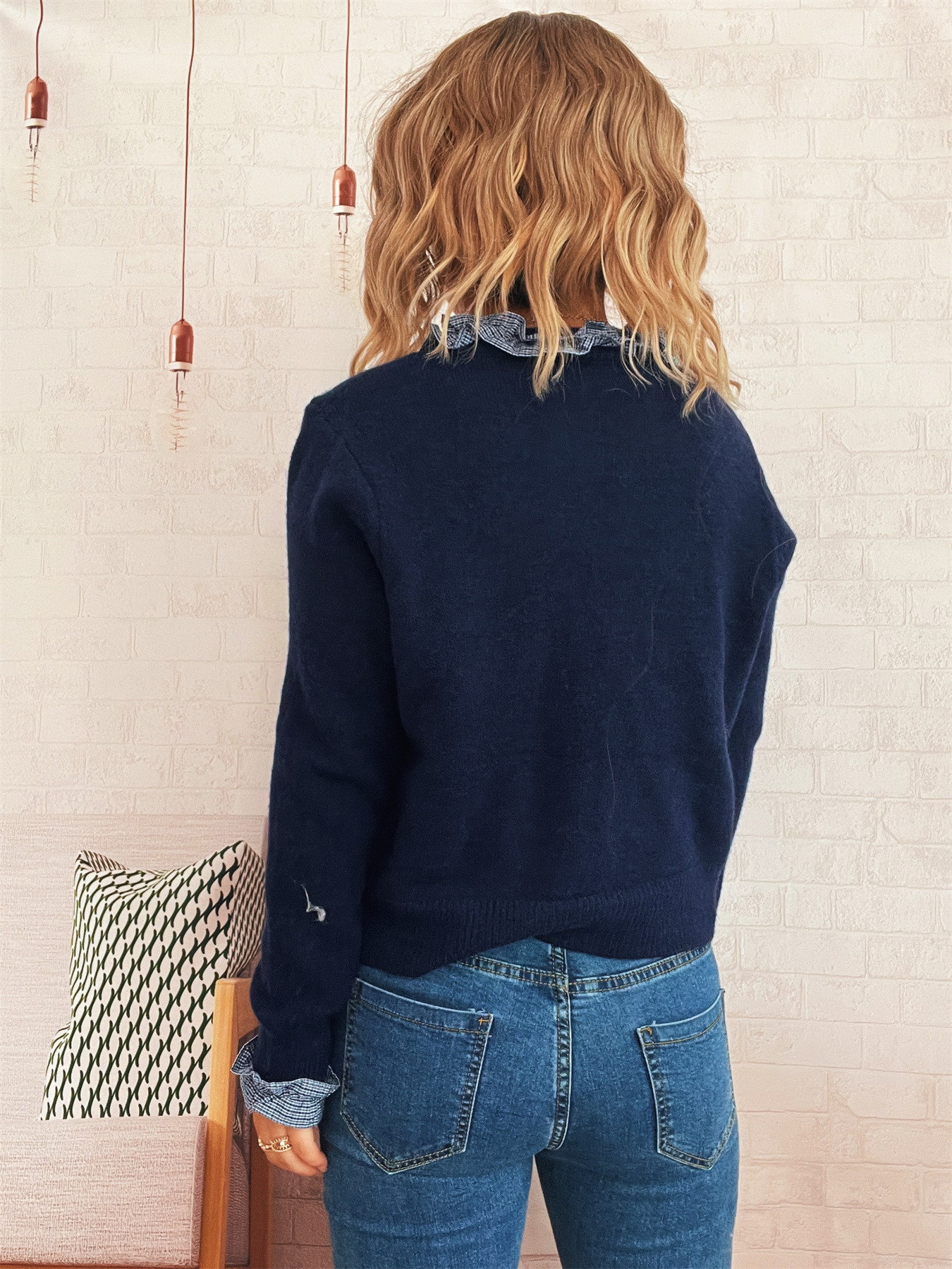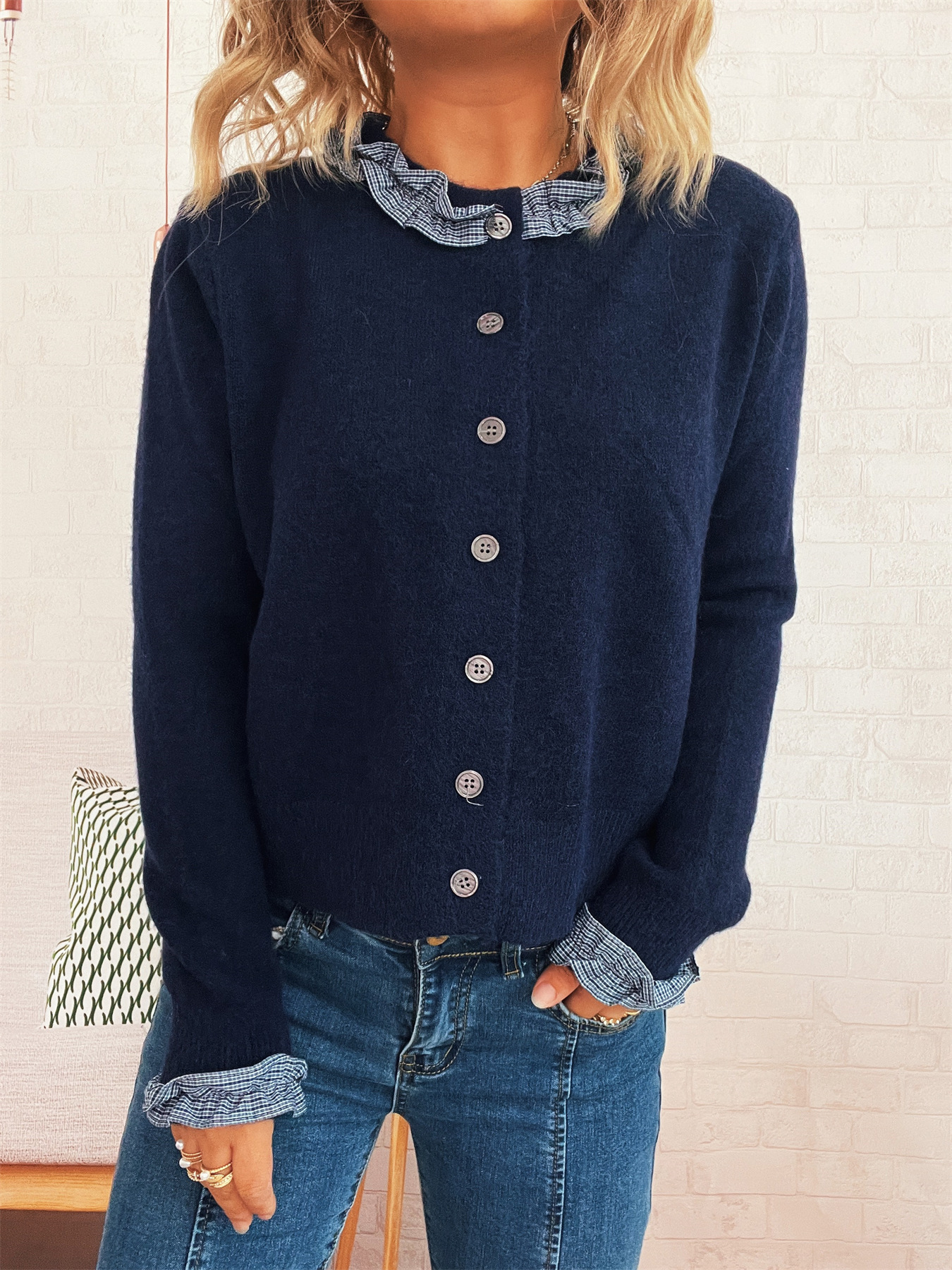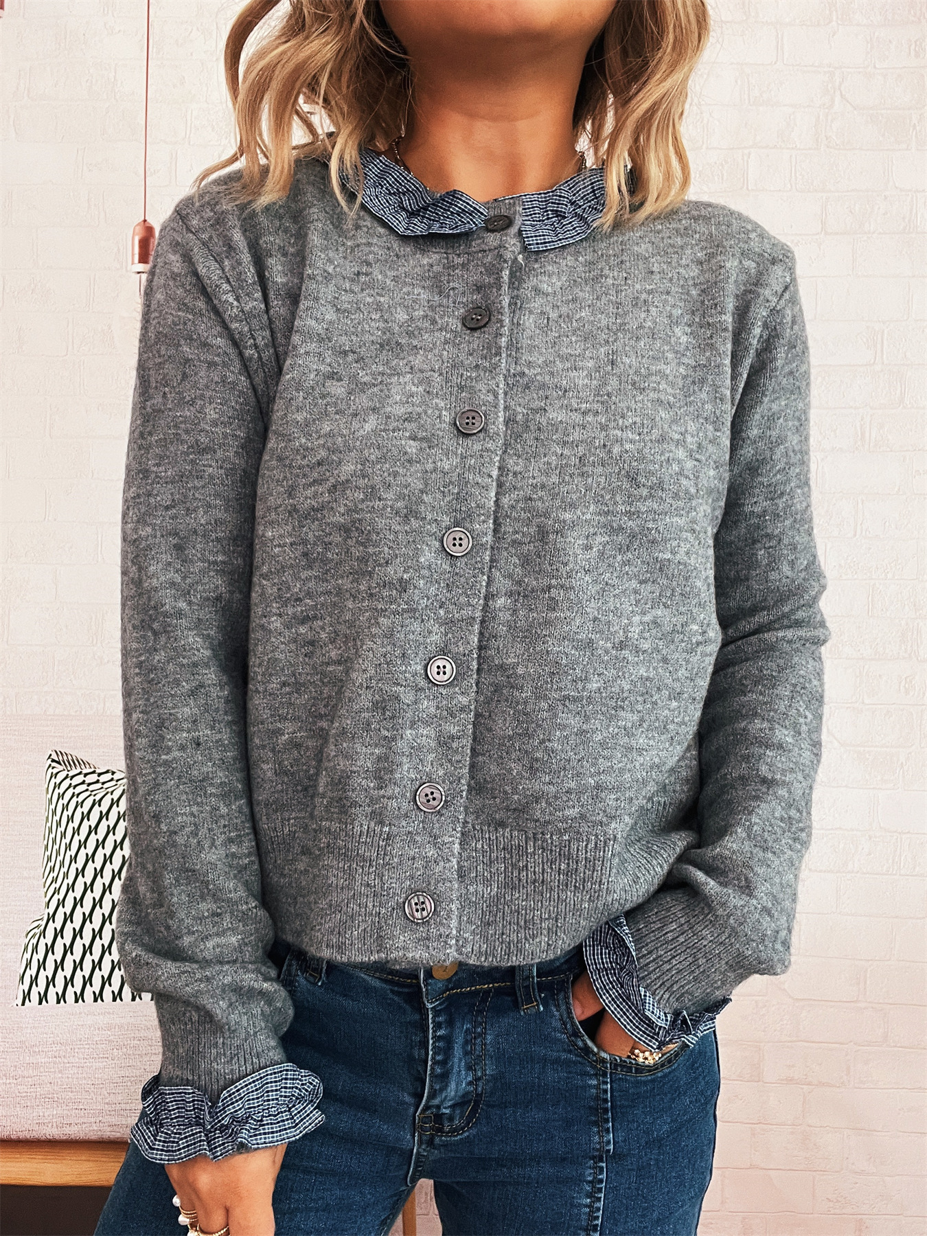 Lace Stitching Single-breasted Long Sleeve Solid Color Slim Fit Sweater
