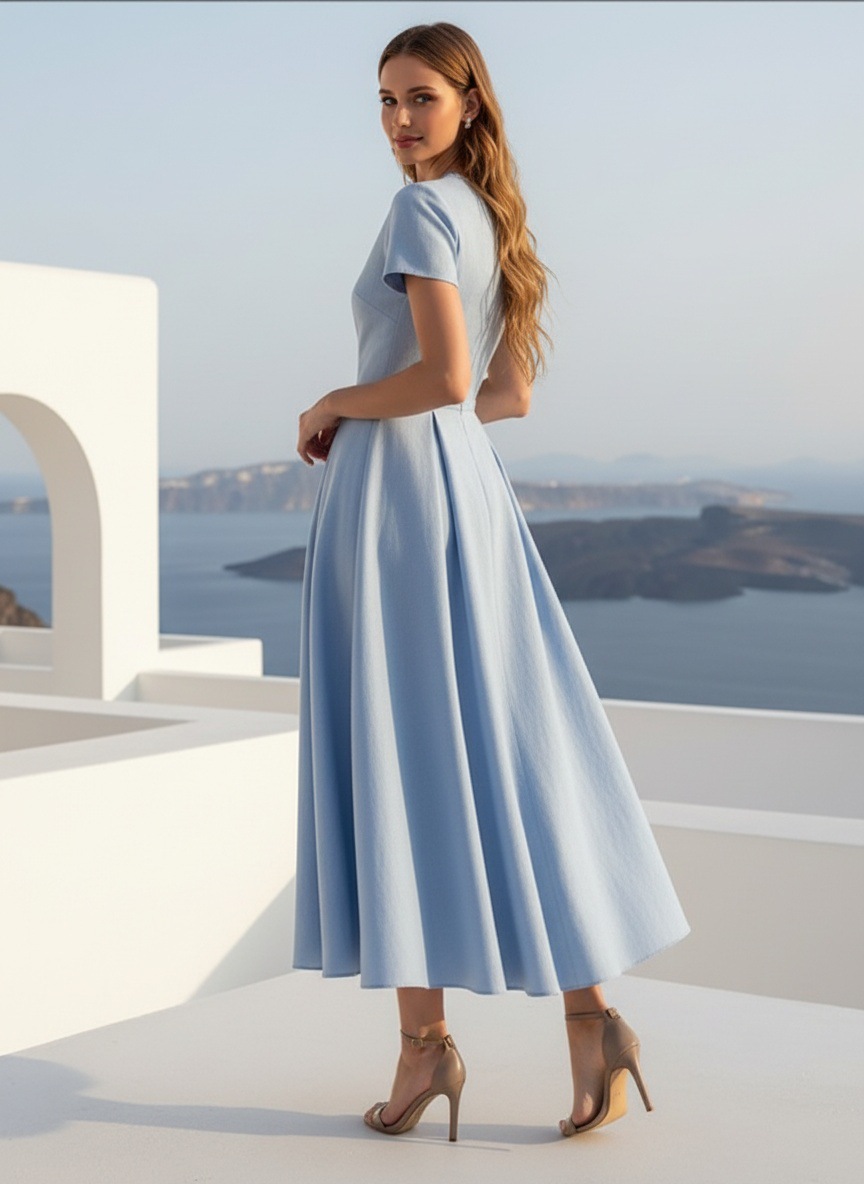 Womens French-Style V-Neck Lace-Waisted Short-Sleeve Dress