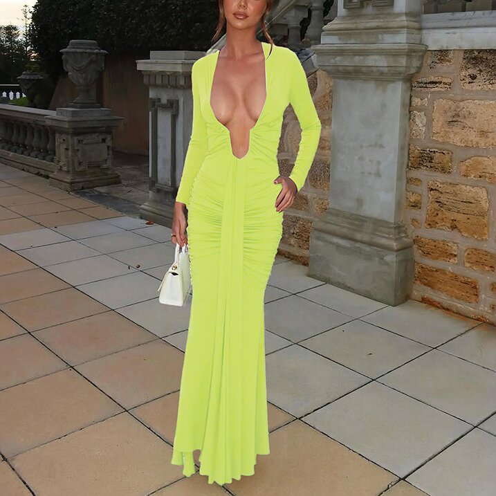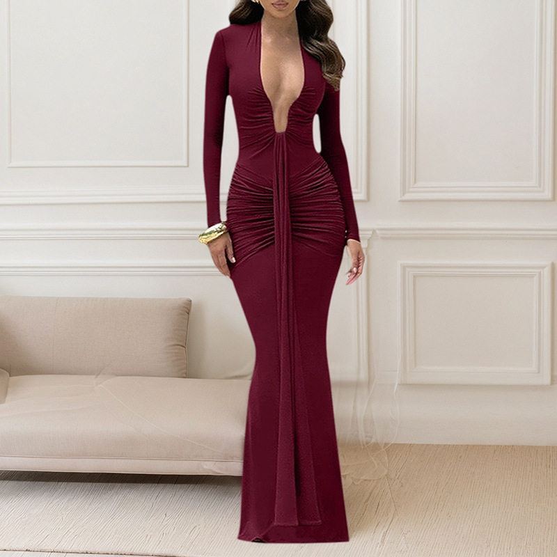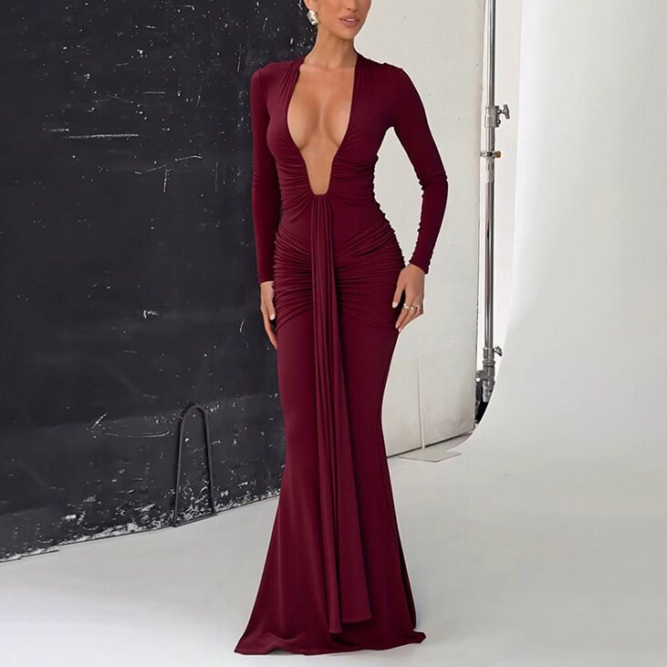 Solid-color Elegant Deep-V Waist-cinched Sexy Long-sleeve Dress With Fluttering Ribbons For Women