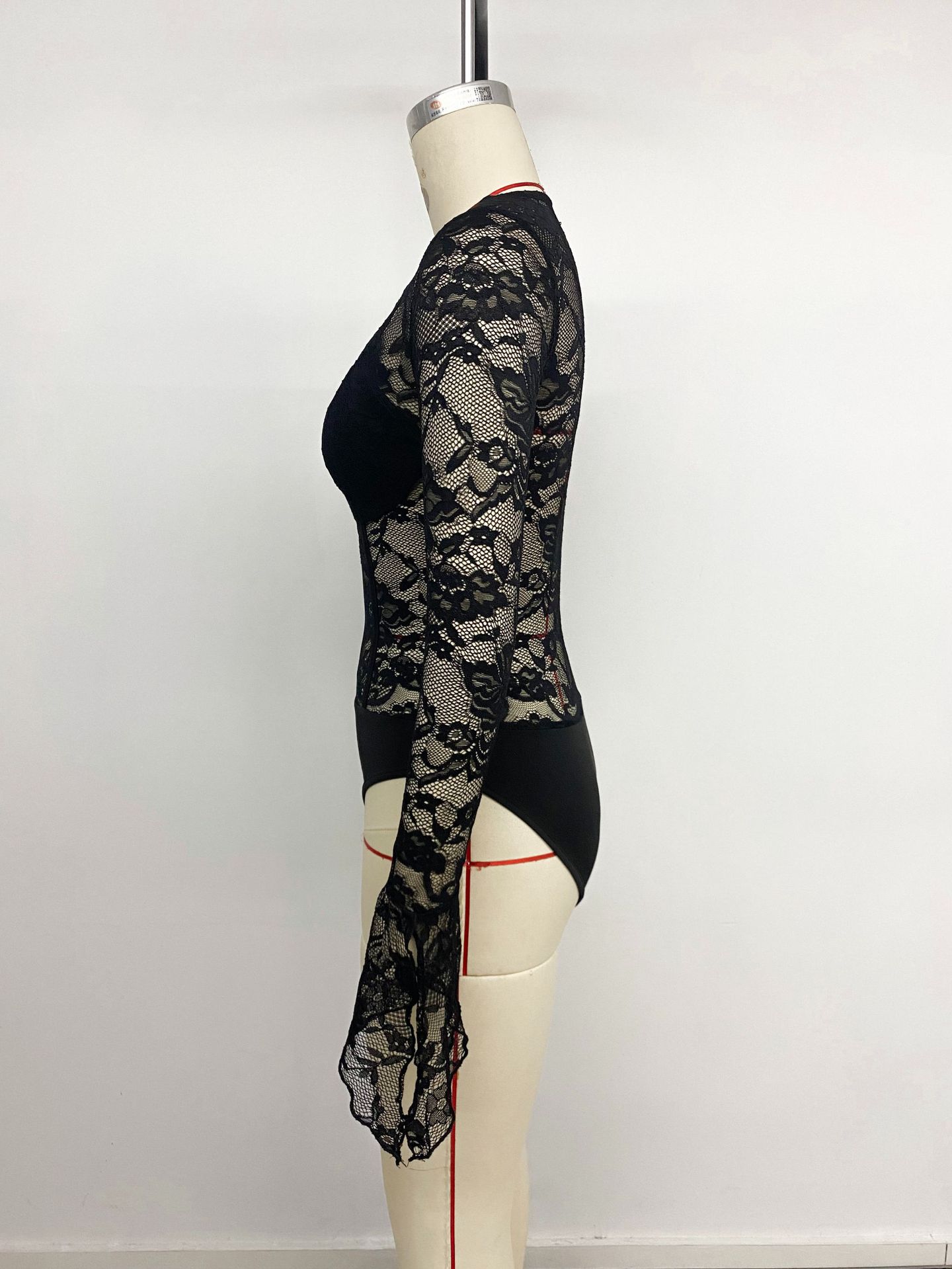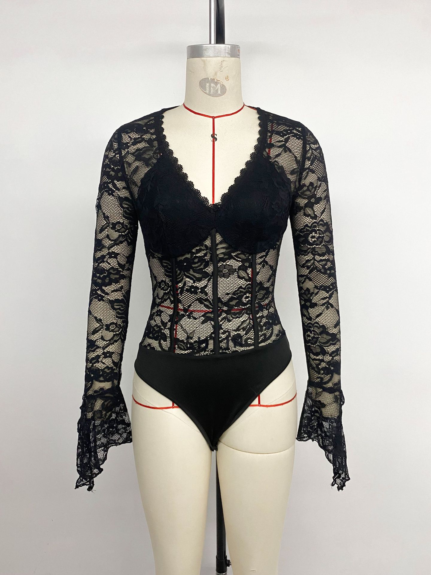 Lace-trimmed V-neck Bodycon Black Jumpsuit