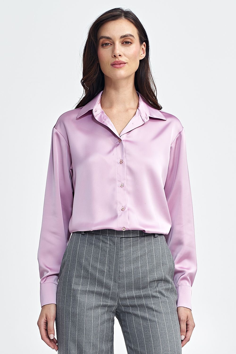 A body with a regular cut, made of satin-like material that adds elegance and subtle shine. It has a classic collar and long sleeves with cuffs, giving the whole a timeless style. The button front closure and snap fasteners at the crotch provide comfort and ease of wear. The lower part, i.e. the panties, are made of elastic material, which guarantees a perfect fit to the silhouette and comfort throughout the day. This body combines classic design with modern finishing, creating a universal wardrobe element.