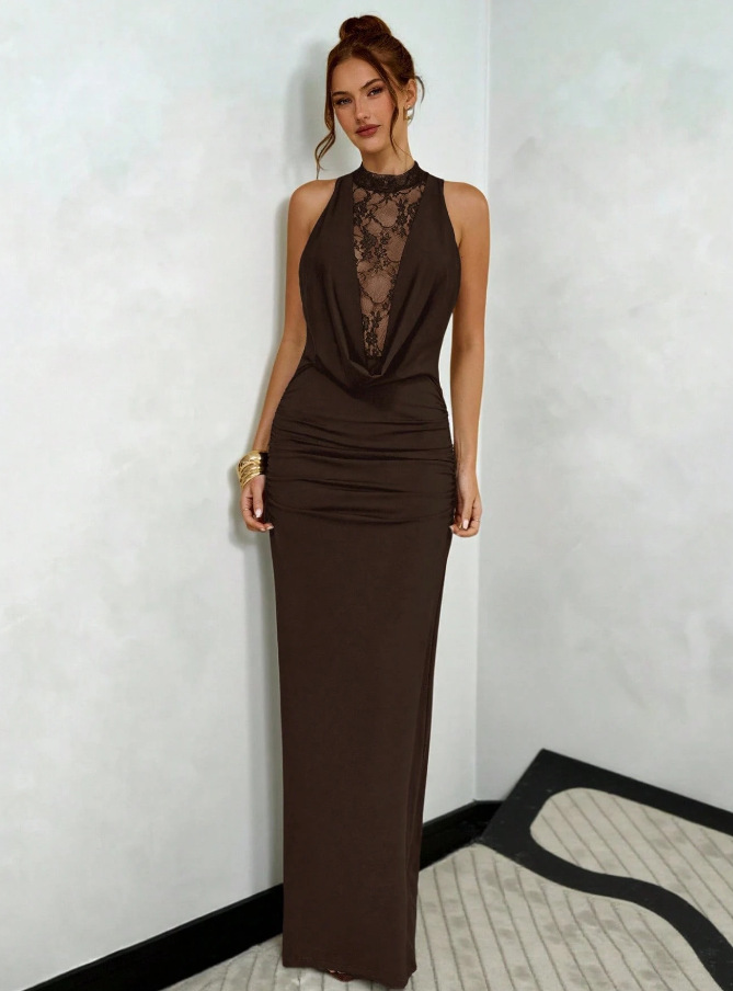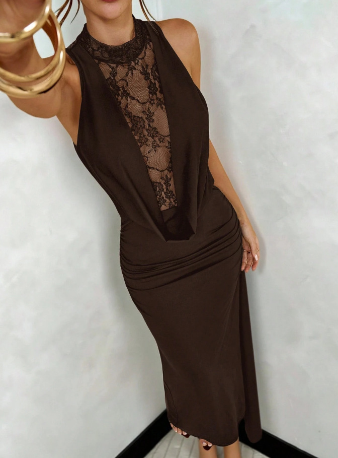 Strapless Deep V-Neck Spliced Lace Draped Bodycon Dress
