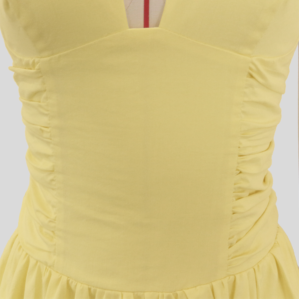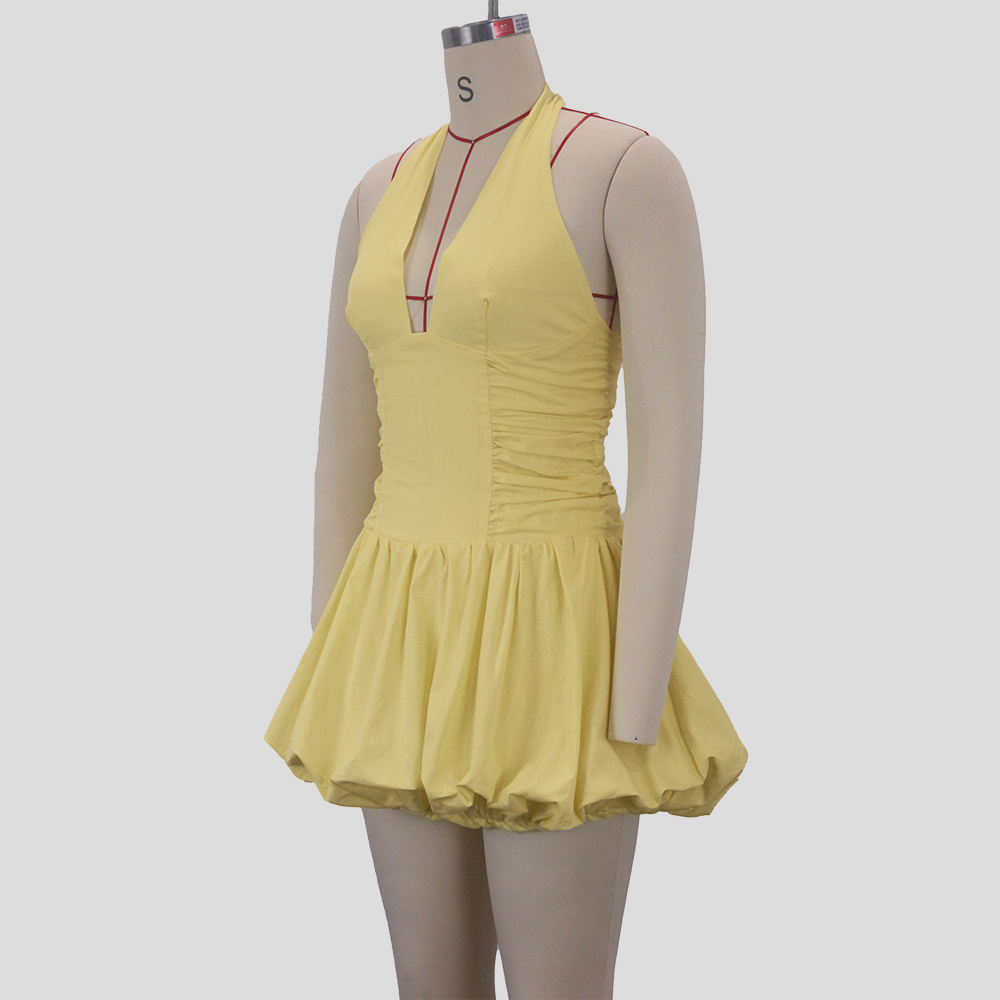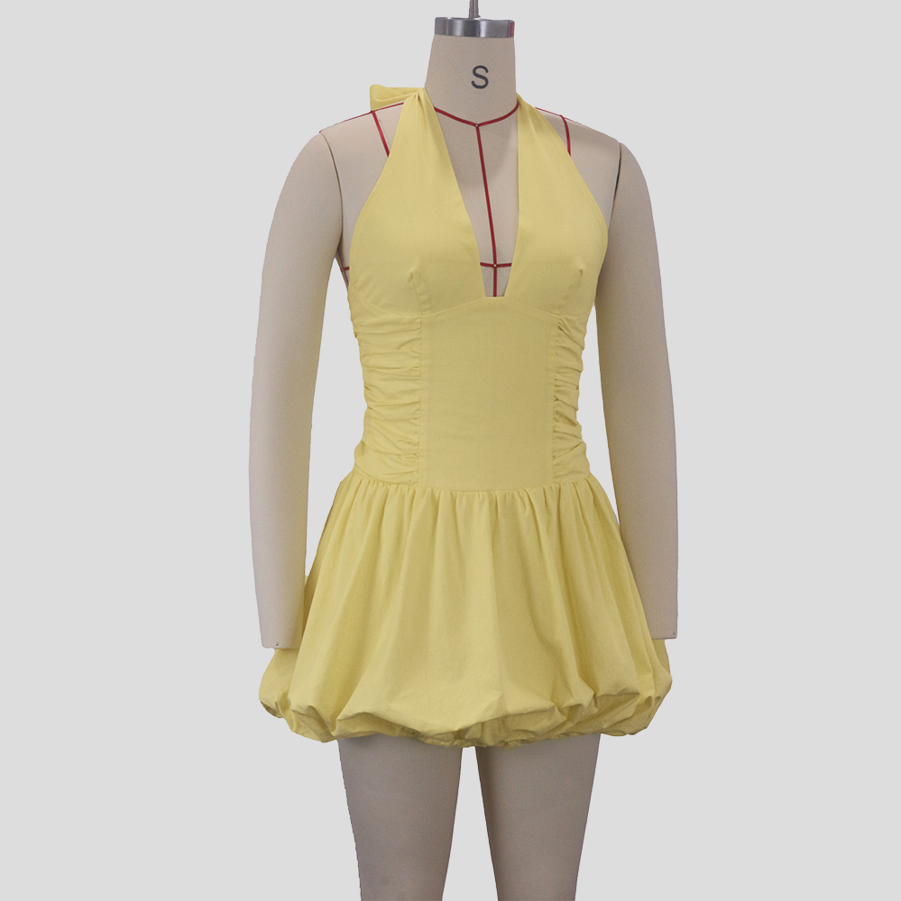 Women's Fashion Deep V Backless Halter Neck Tie Ribbon Bow Bubble Mini Dress