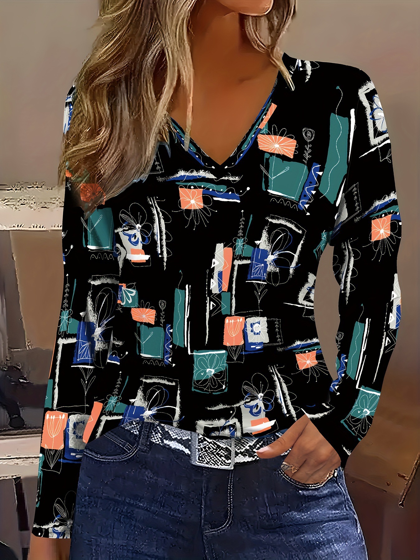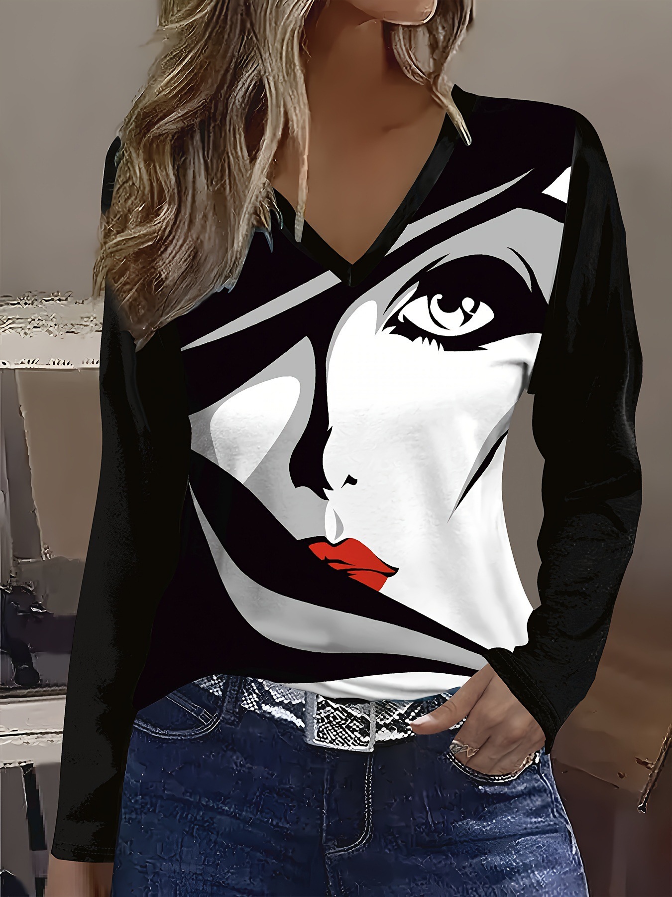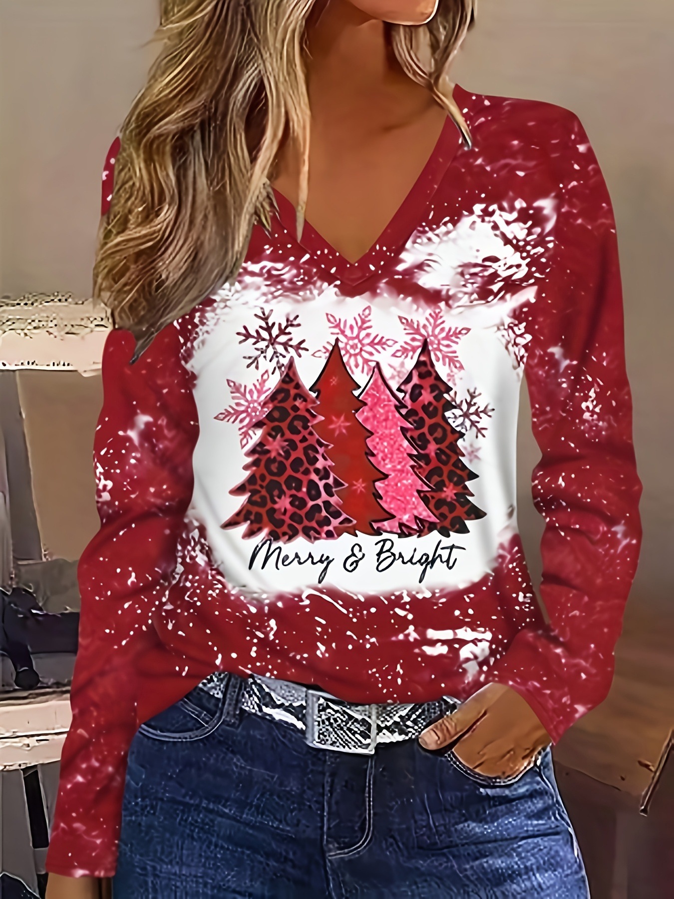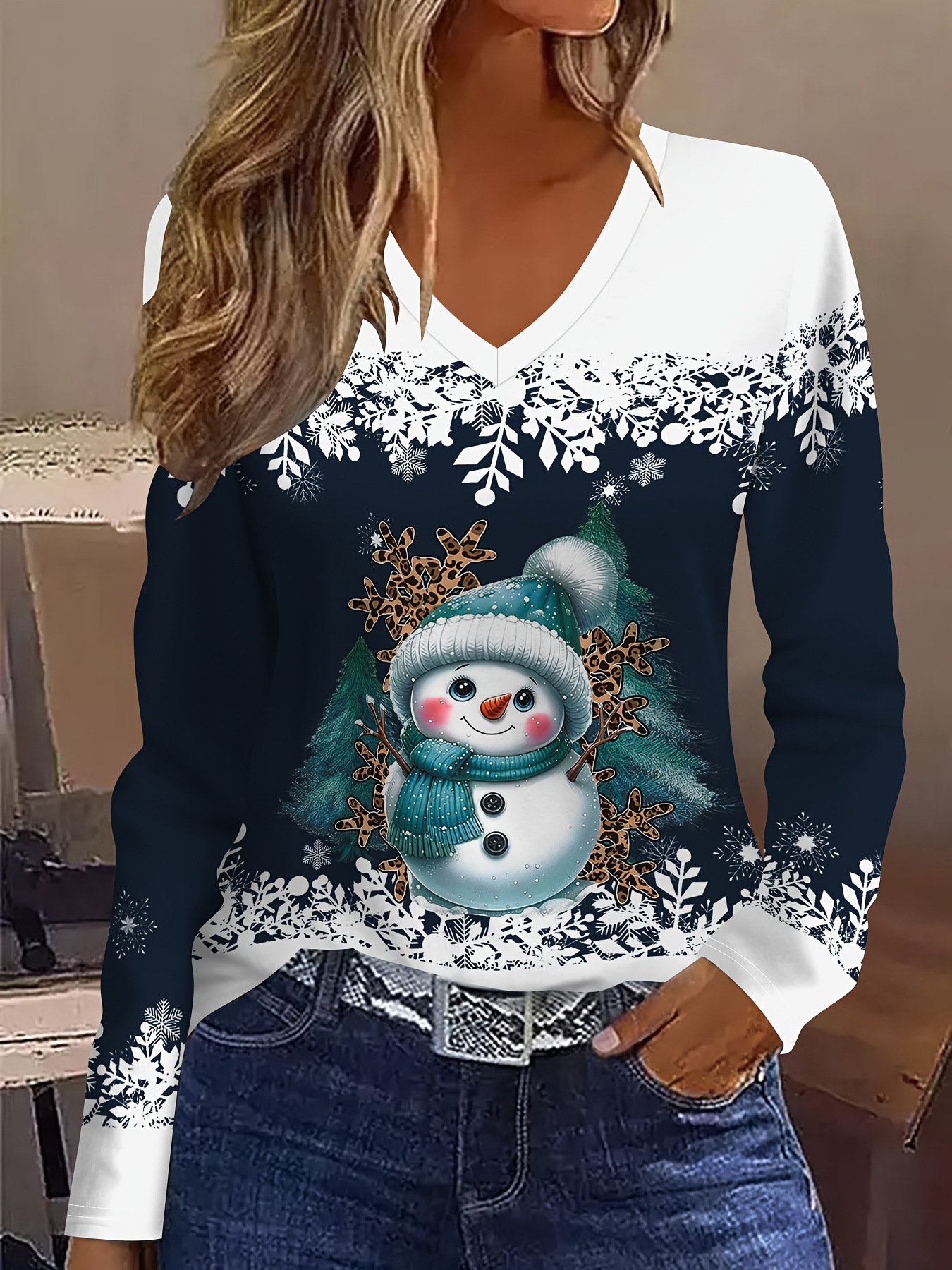 New Christmas Snowman V-neck Printed Long-sleeve Womens Top