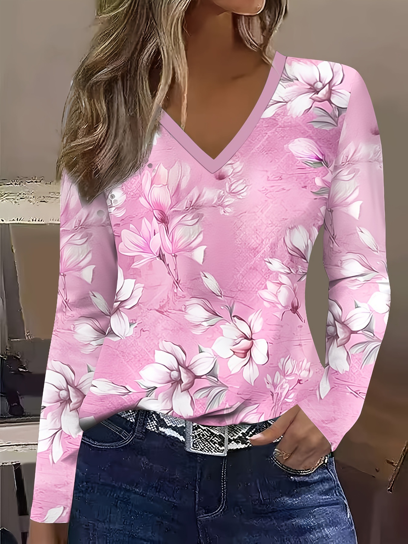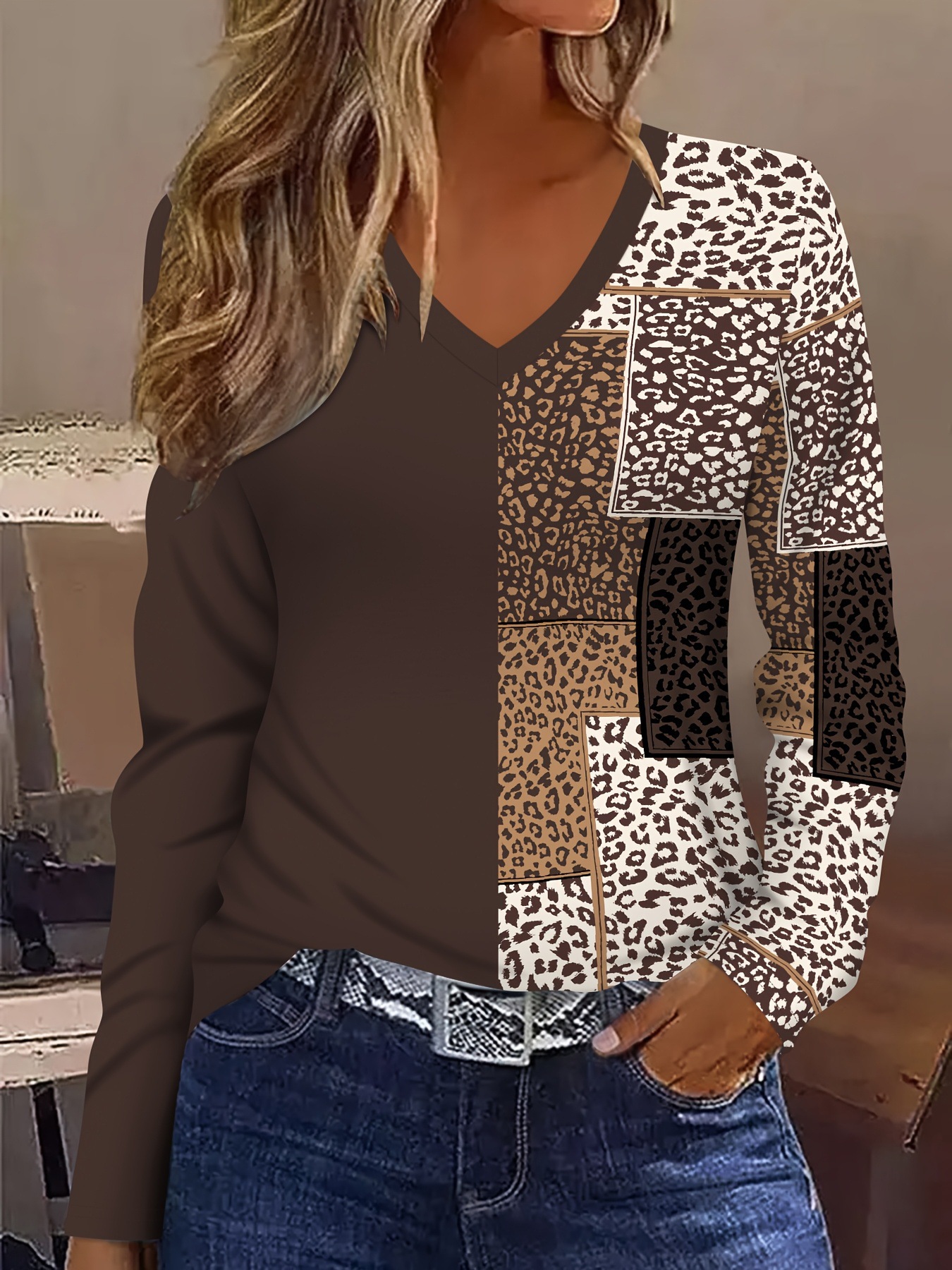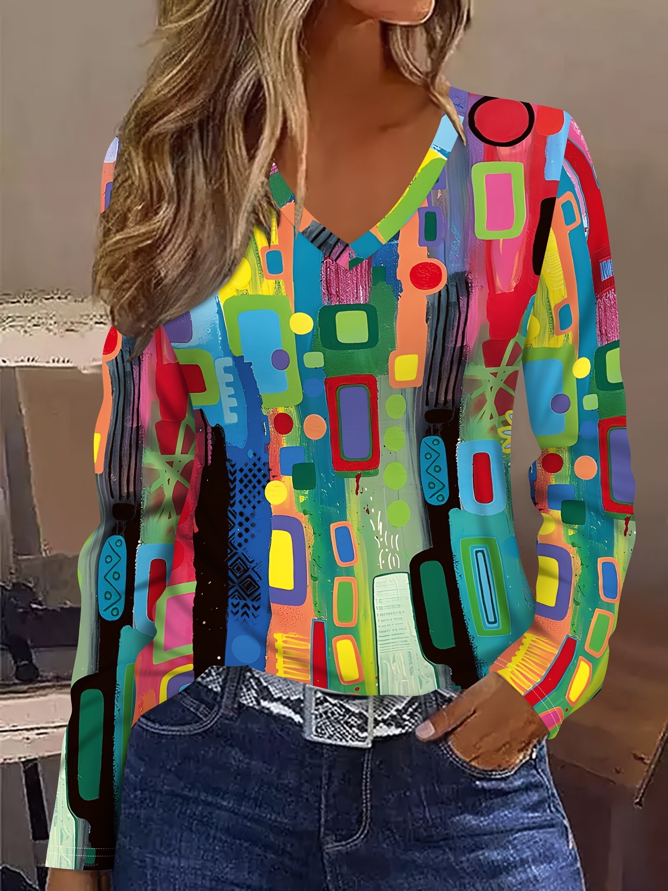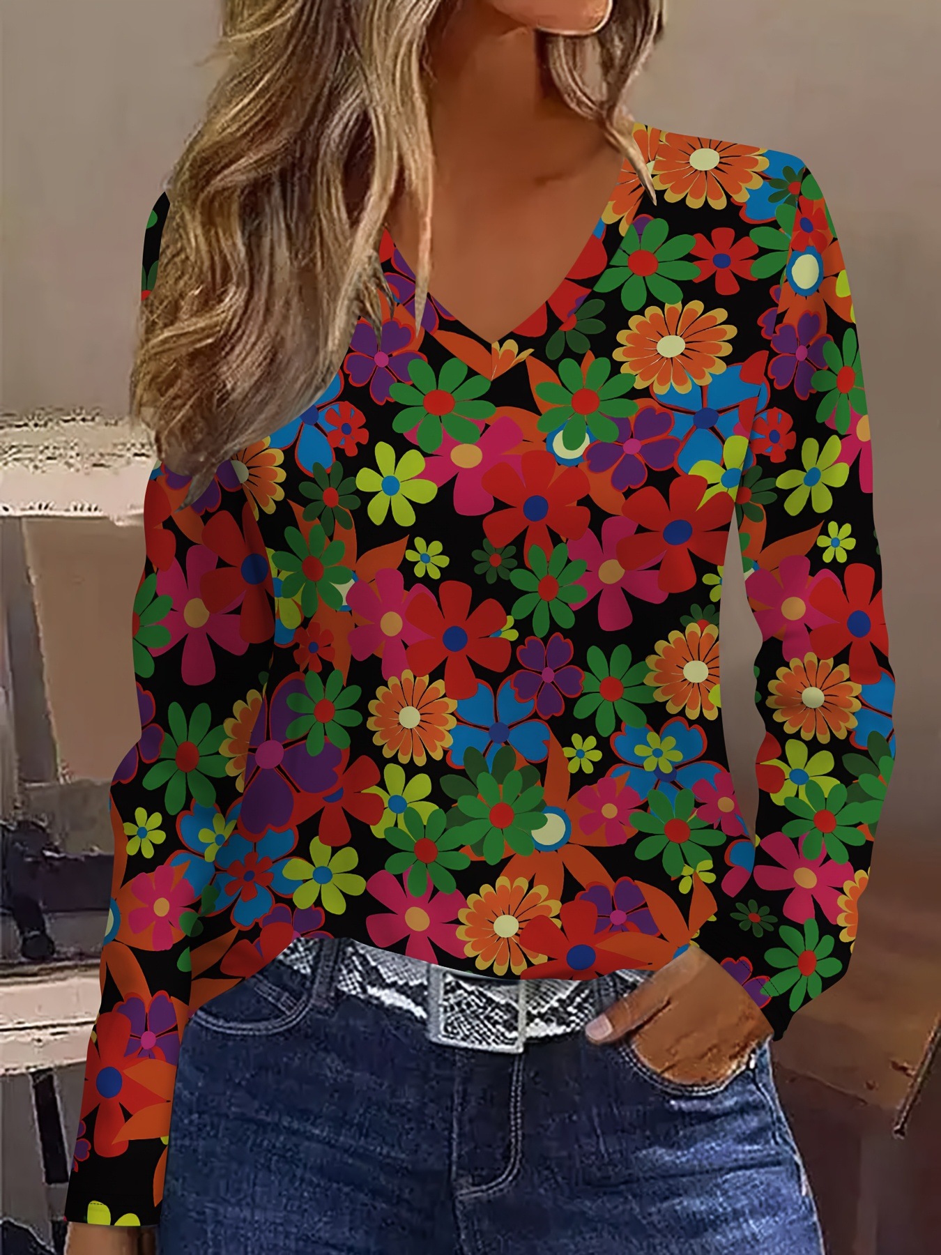 New Christmas Snowman V-neck Printed Long-sleeve Womens Top
