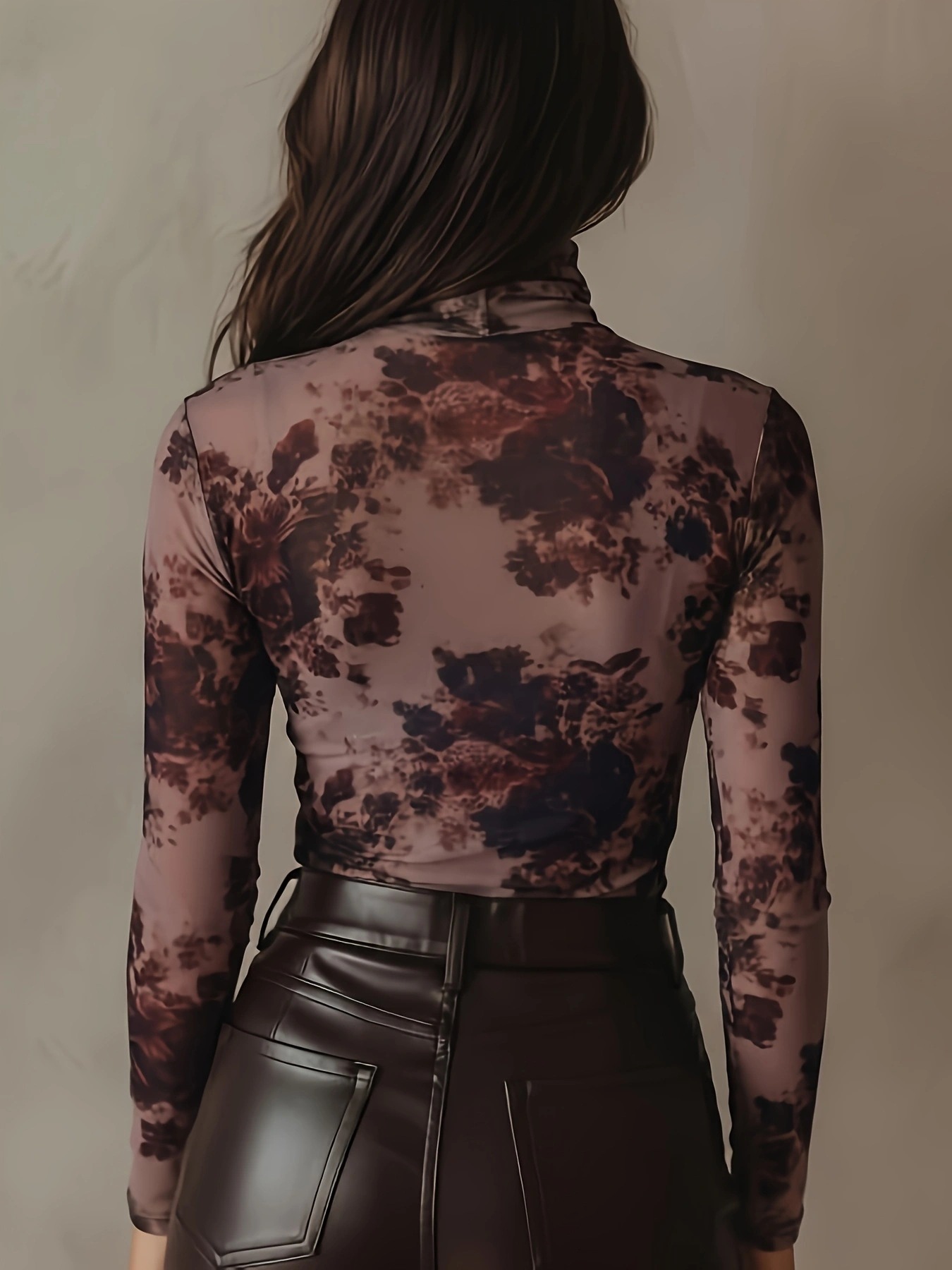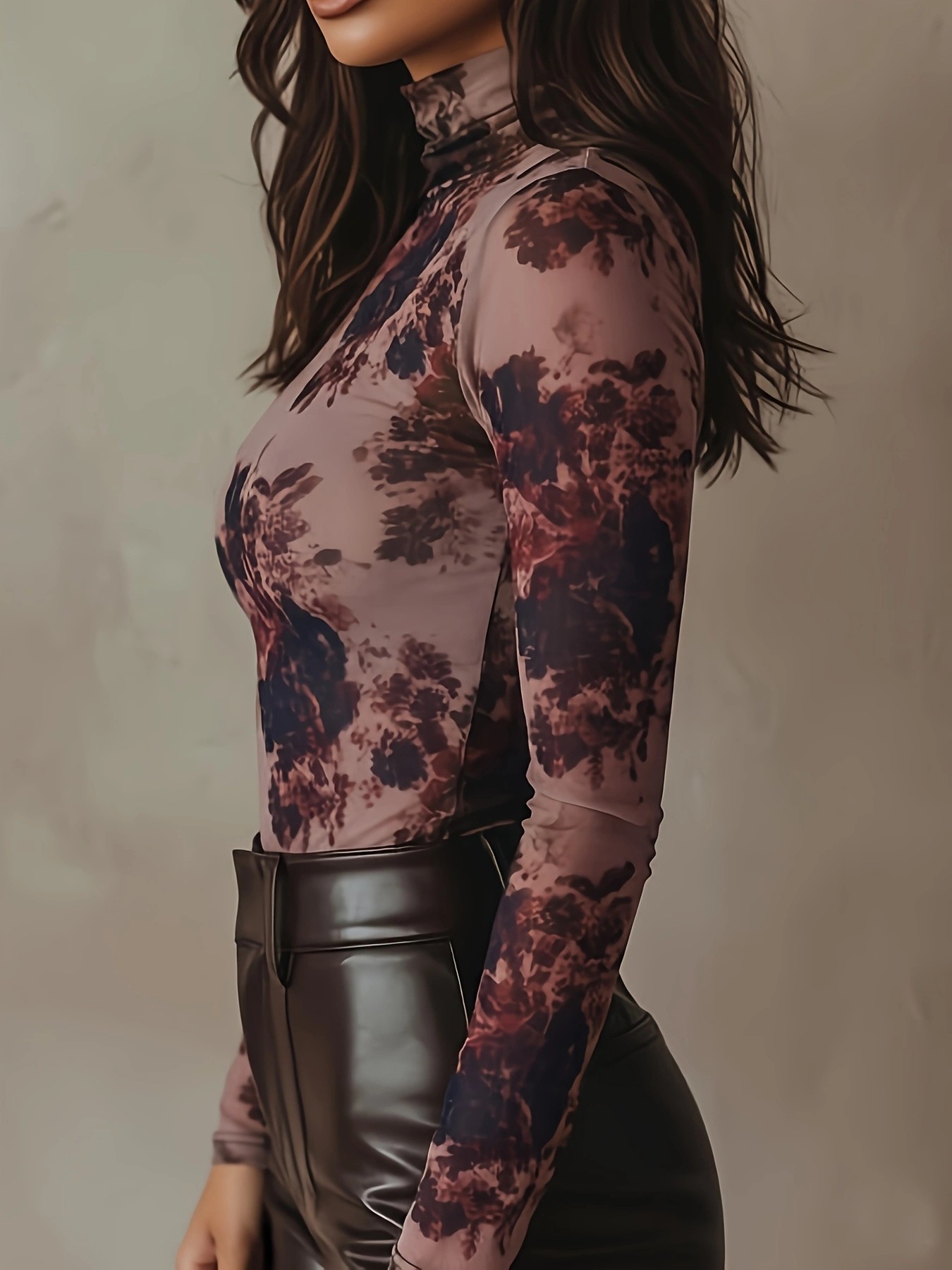 Retro Floral Print High-Neck Mesh Long-Sleeve Slim-Fit Base Top